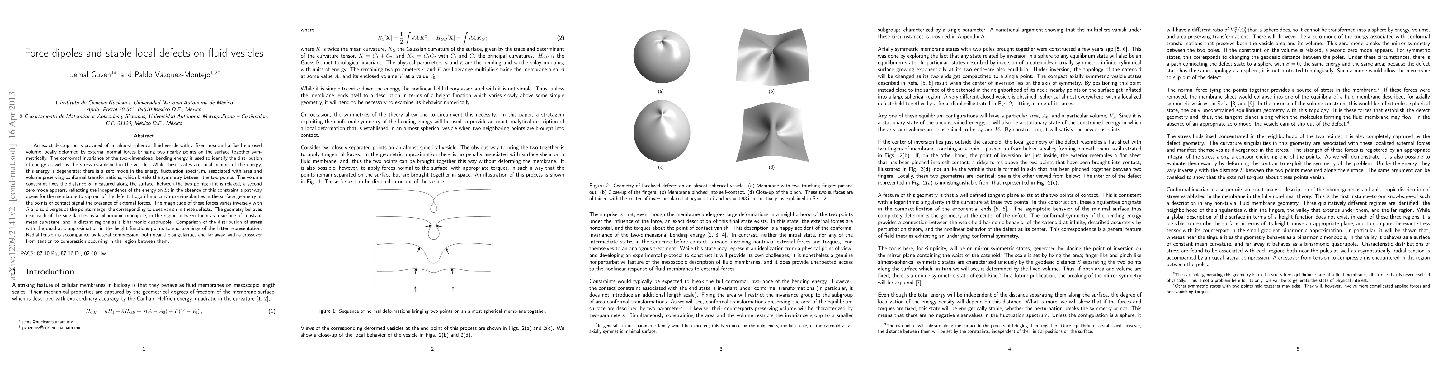 An exact description is provided of an almost spherical fluid vesicle with a fixed area and a fixed enclosed volume locally deformed by external normal forces bringing two nearby points on the surface together symmetrically. The conformal invariance of the two-dimensional bending energy is used to identify the distribution of energy as well as the stress established in the vesicle. While these states are local minima of the energy, this energy is degenerate; there is a zero mode in the energy fluctuation spectrum, associated with area and volume preserving conformal transformations, which breaks the symmetry between the two points. The volume constraint fixes the distance $S$, measured along the surface, between the two points; if it is relaxed, a second zero mode appears, reflecting the independence of the energy on $S$; in the absence of this constraint a pathway opens for the membrane to slip out of the defect. Logarithmic curvature singularities in the surface geometry at the points of contact signal the presence of external forces. The magnitude of these forces varies inversely with $S$ and so diverges as the points merge; the corresponding torques vanish in these defects. The geometry behaves near each of the singularities as a biharmonic monopole, in the region between them as a surface of constant mean curvature, and in distant regions as a biharmonic quadrupole. Comparison of the distribution of stress with the quadratic approximation in the height functions points to shortcomings of the latter representation. Radial tension is accompanied by lateral compression, both near the singularities and far away, with a crossover from tension to compression occurring in the region between them.