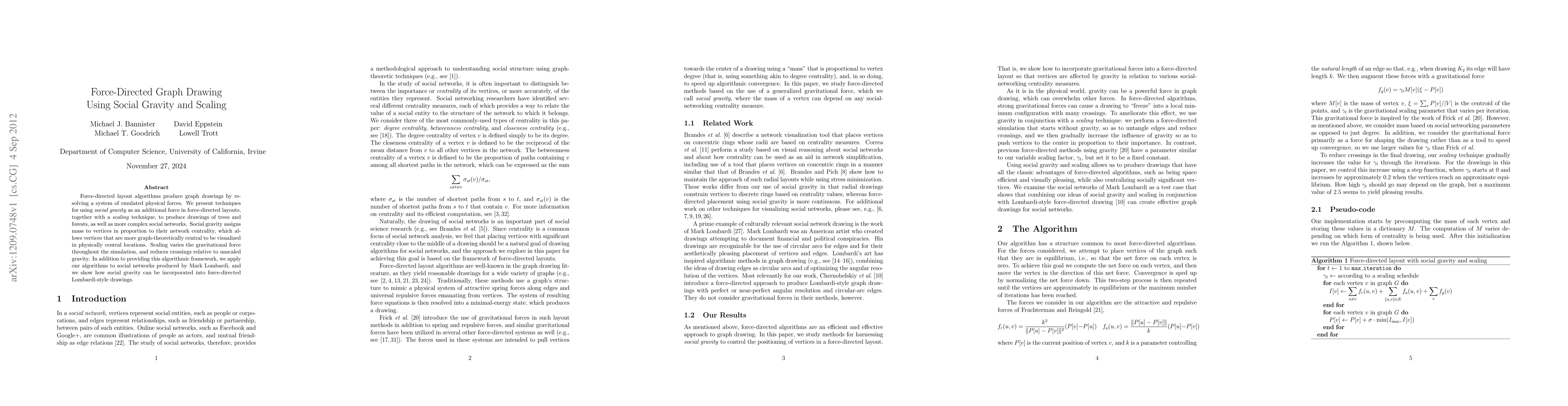 This paper introduces force-directed graph drawing techniques that incorporate social gravity and scaling to enhance visualization of complex social networks. Social gravity assigns mass to vertices based on their centrality, while scaling adjusts gravitational forces to reduce crossings, producing more intuitive and aesthetically pleasing graph layouts.