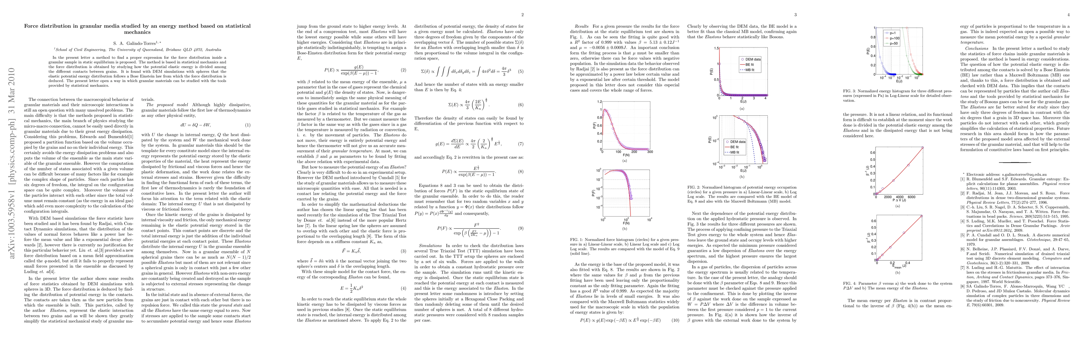 This paper proposes a statistical mechanics-based energy method to determine the force distribution within granular media in static equilibrium. Using DEM simulations, it finds that the elastic potential energy distribution follows a Bose-Einstein law, leading to a deduced force distribution.