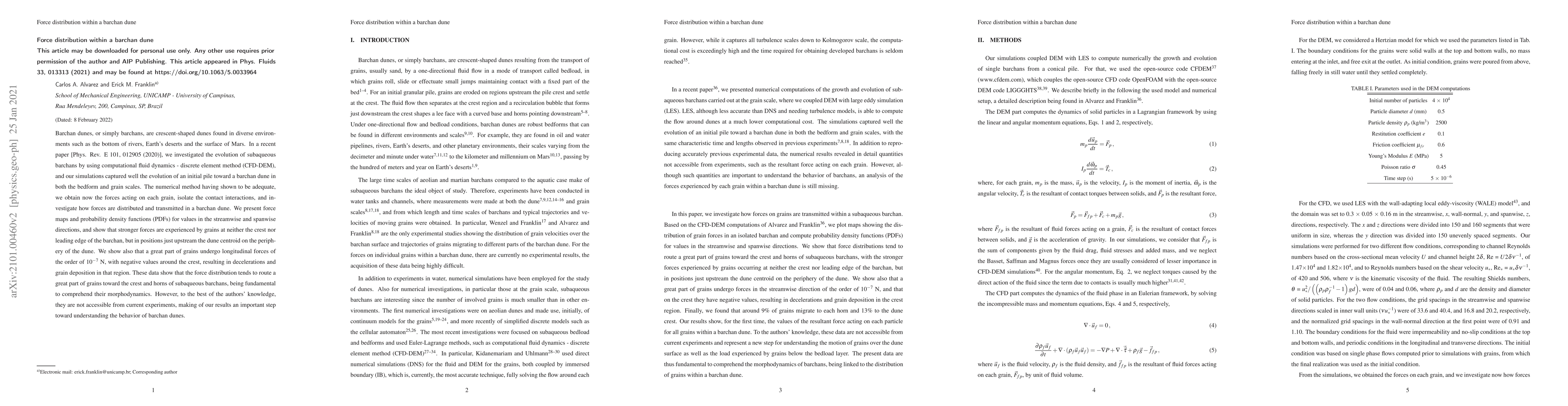 This paper investigates the force distribution within subaqueous barchan dunes using CFD-DEM simulations, revealing that stronger forces are experienced upstream of the dune centroid rather than at the crest or leading edge. The study highlights the importance of these forces in guiding grain movement and shaping the dune's morphodynamics.