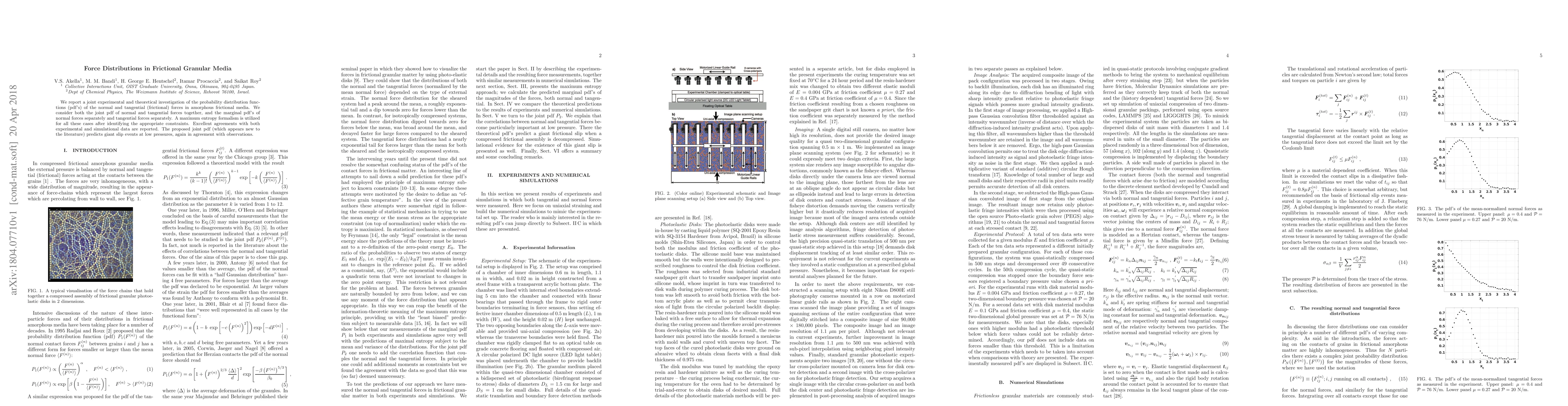 We report a joint experimental and theoretical investigation of the probability distribution functions (pdf's) of the normal and tangential (frictional) forces in amorphous frictional media. We consider both the joint pdf of normal and tangential forces together, and the marginal pdf's of normal forces separately and tangential forces separately. A maximum entropy formalism is utilized for all these cases after identifying the appropriate constraints. Excellent agreements with both experimental and simulational data are reported. The proposed joint pdf (which appears new to the literature) predicts giant slip events at low pressures, again in agreement with observations.