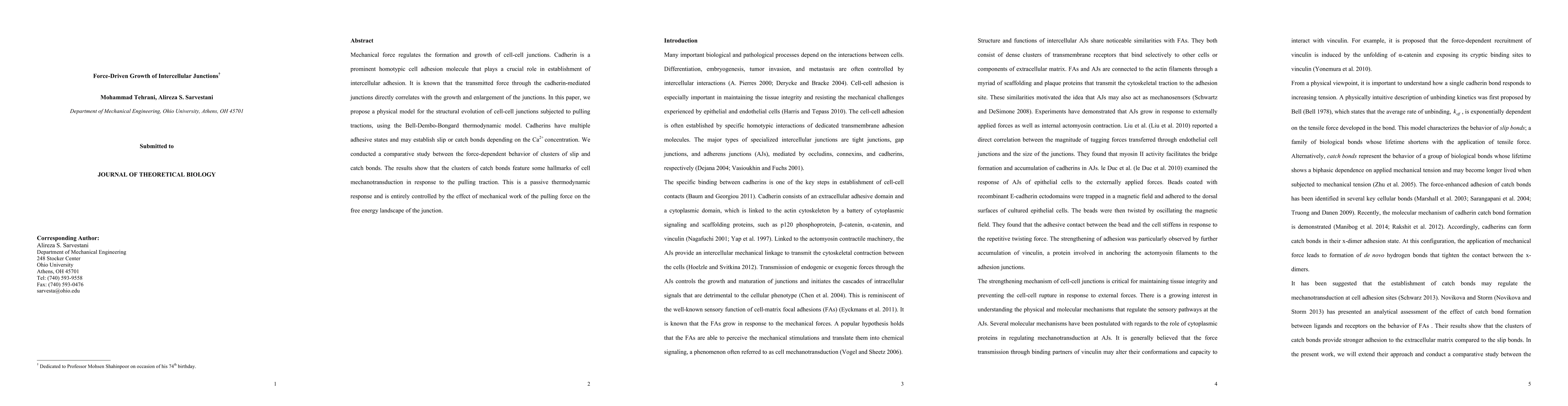 This paper develops a physical model for the growth of intercellular junctions driven by mechanical force, focusing on cadherin-mediated adhesion. It compares the behavior of slip and catch bonds under traction, showing that catch bonds exhibit characteristics of mechanotransduction, influenced by the mechanical work affecting the junction's free energy landscape.