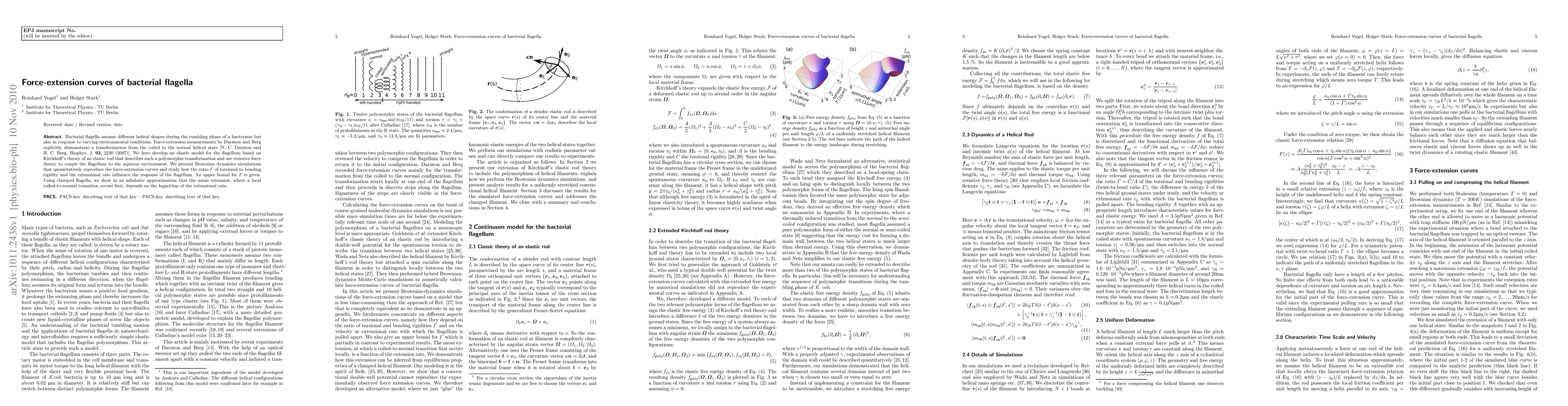 This paper develops an elastic model for bacterial flagella based on Kirchhoff's theory, showing how flagella transform from coiled to normal helical states under varying forces. The study uses Brownian dynamics simulations to reproduce force-extension curves and analyzes the influence of torsional and bending rigidity ratios on flagella response.