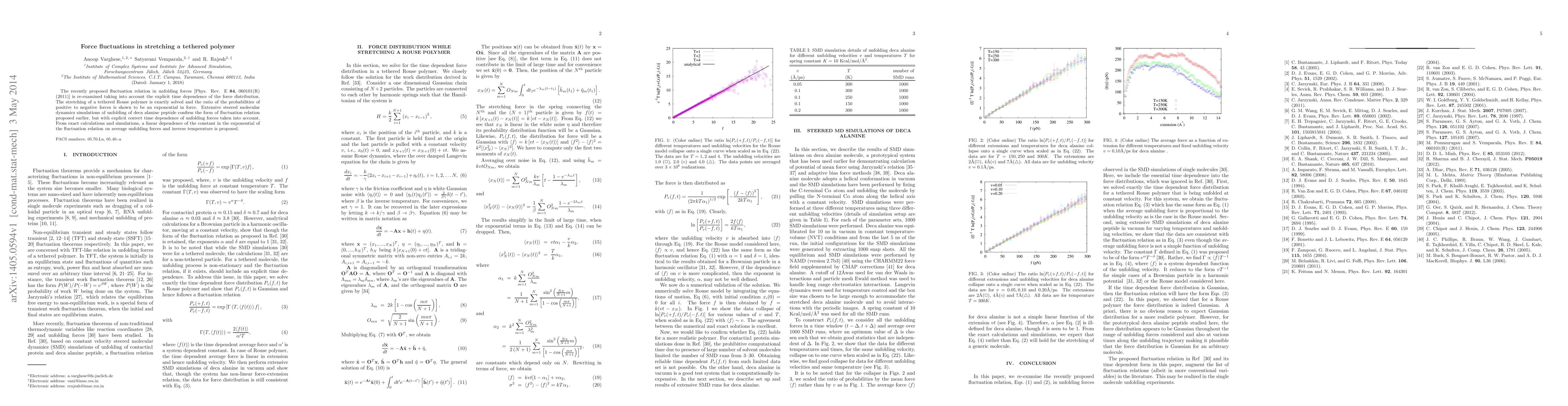 The recently proposed fluctuation relation in unfolding forces [Phys. Rev. E ${\bf 84}$, $060101$(R) $(2011)$] is re-examined taking into account the explicit time dependence of the force distribution. The stretching of a tethered Rouse polymer is exactly solved and the ratio of the probabilities of positive to negative forces is shown to be an exponential in force. Extensive steered molecular dynamics simulations of unfolding of deca alanine peptide confirm the form of fluctuation relation proposed earlier, but with explicit correct time dependence of unfolding forces taken into account. From exact calculations and simulations, a linear dependence of the constant in the exponential of the fluctuation relation on average unfolding forces and inverse temperature is proposed.
