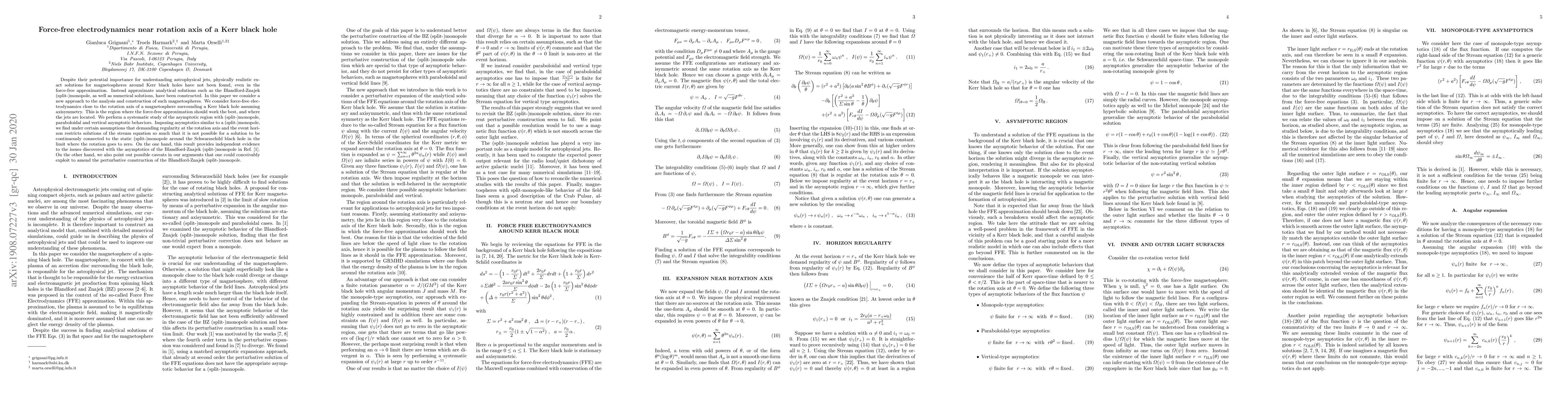 Despite their potential importance for understanding astrophysical jets, physically realistic exact solutions for magnetospheres around Kerr black holes have not been found, even in the force-free approximation. Instead approximate analytical solutions such as the Blandford-Znajek (split-)monopole, as well as numerical solutions, have been constructed. In this paper we consider a new approach to the analysis and construction of such magnetospheres. We consider force-free electrodynamics close to the rotation axis of a magnetosphere surrounding a Kerr black hole assuming axisymmetry. This is the region where the force-free approximation should work the best, and where the jets are located. We perform a systematic study of the asymptotic region with (split-)monopole, paraboloidal and vertical asymptotic behaviors. Imposing asymptotics similar to a (split-)monopole, we find under certain assumptions that demanding regularity at the rotation axis and the event horizon restricts solutions of the stream equation so much that it is not possible for a solution to be continuously connected to the static (split-)monopole around the Schwarzschild black hole in the limit where the rotation goes to zero. On the one hand, this result provides independent evidence to the issues discovered with the asymptotics of the Blandford-Znajek (split-)monopole in Ref. [1]. On the other hand, we also point out possible caveats in our arguments that one could conceivably exploit to amend the perturbative construction of the Blandford-Znajek (split-)monopole.