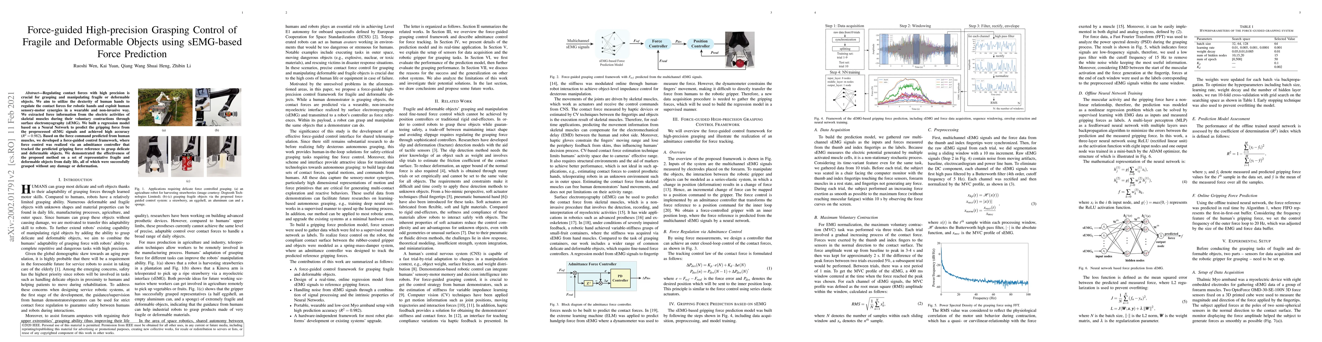 This paper presents a method for high-precision grasping control of fragile and deformable objects using sEMG-based force prediction. The authors developed a Neural Network regression model to predict gripping force from sEMG signals, achieving high accuracy, and implemented a force-guided control framework to successfully grasp delicate objects without damage.