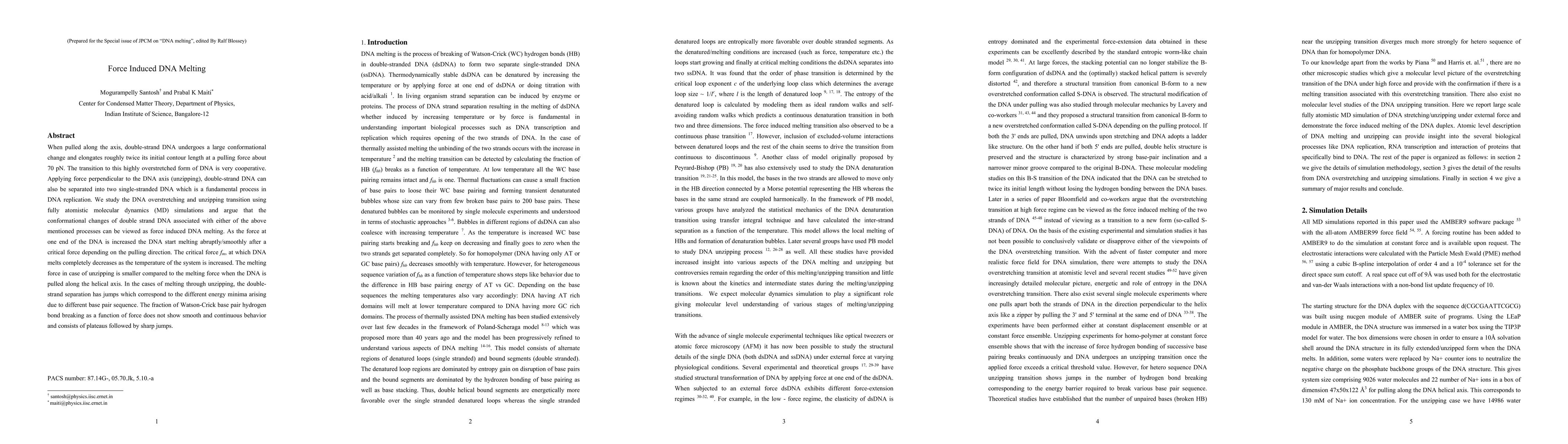 When pulled along the axis, double-strand DNA undergoes a large conformational change and elongates roughly twice its initial contour length at a pulling force about 70 pN. The transition to this highly overstretched form of DNA is very cooperative. Applying force perpendicular to the DNA axis (unzipping), double-strand DNA can also be separated into two single-stranded DNA which is a fundamental process in DNA replication. We study the DNA overstretching and unzipping transition using fully atomistic molecular dynamics (MD) simulations and argue that the conformational changes of double strand DNA associated with either of the above mentioned processes can be viewed as force induced DNA melting. As the force at one end of the DNA is increased the DNA start melting abruptly/smoothly after a critical force depending on the pulling direction. The critical force fm, at which DNA melts completely decreases as the temperature of the system is increased. The melting force in case of unzipping is smaller compared to the melting force when the DNA is pulled along the helical axis. In the cases of melting through unzipping, the double-strand separation has jumps which correspond to the different energy minima arising due to different base pair sequence. The fraction of Watson-Crick base pair hydrogen bond breaking as a function of force does not show smooth and continuous behavior and consists of plateaus followed by sharp jumps.
