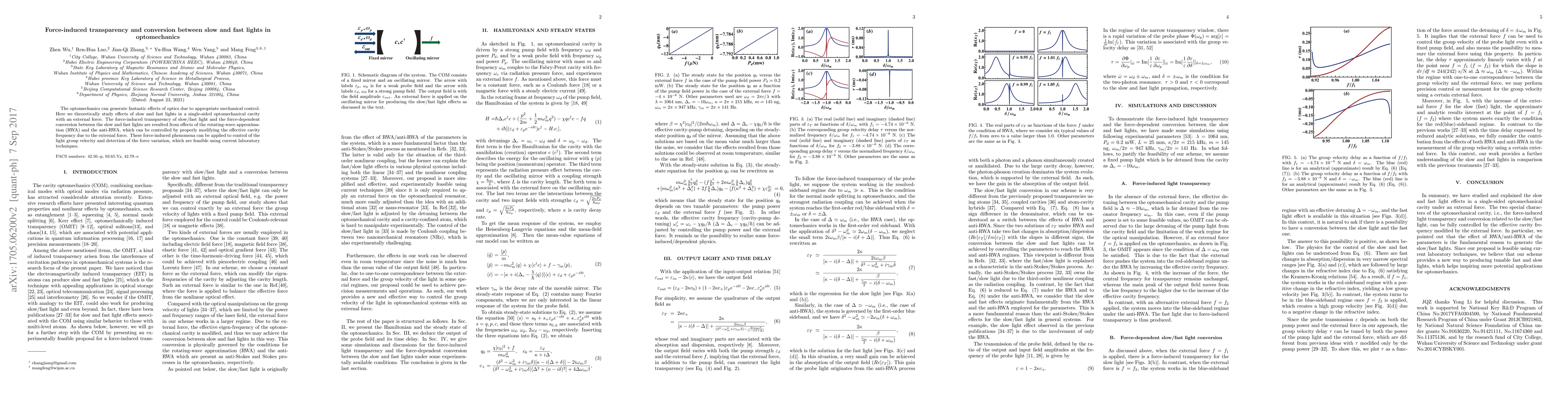 This paper theoretically investigates the optomechanical generation of slow and fast light in a single-sided cavity under an external force, revealing force-induced transparency and the conversion between slow and fast lights due to rotating-wave approximation effects. These phenomena enable control of light group velocity and force variation detection, applicable with current laboratory techniques.