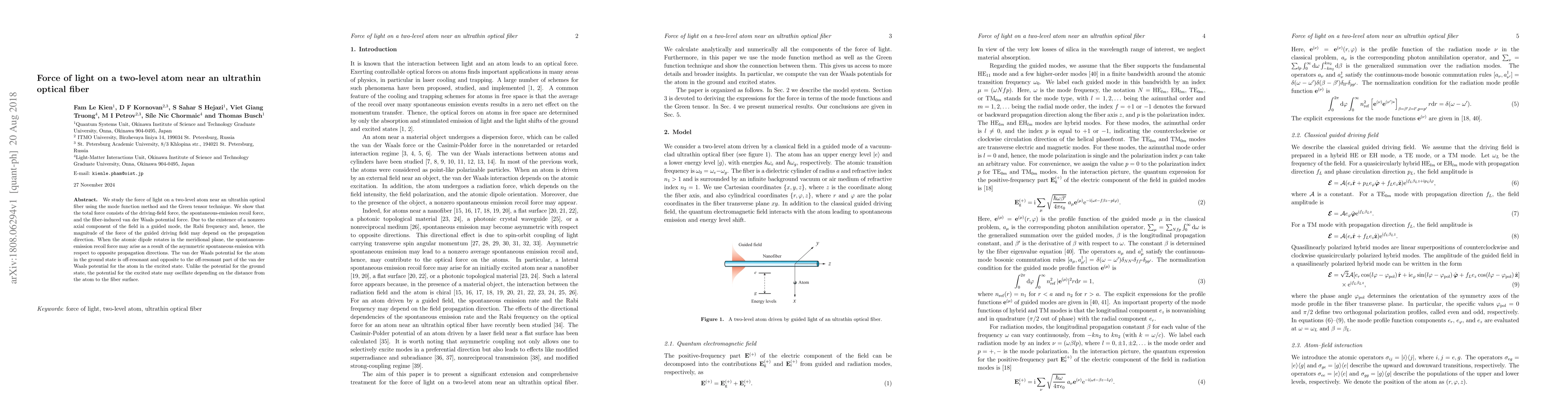 This paper investigates the light force on a two-level atom near an ultrathin optical fiber, revealing contributions from the driving field, spontaneous emission, and fiber-induced van der Waals potential. The force's magnitude and directionality are influenced by the guided mode's axial field component and asymmetric spontaneous emission.