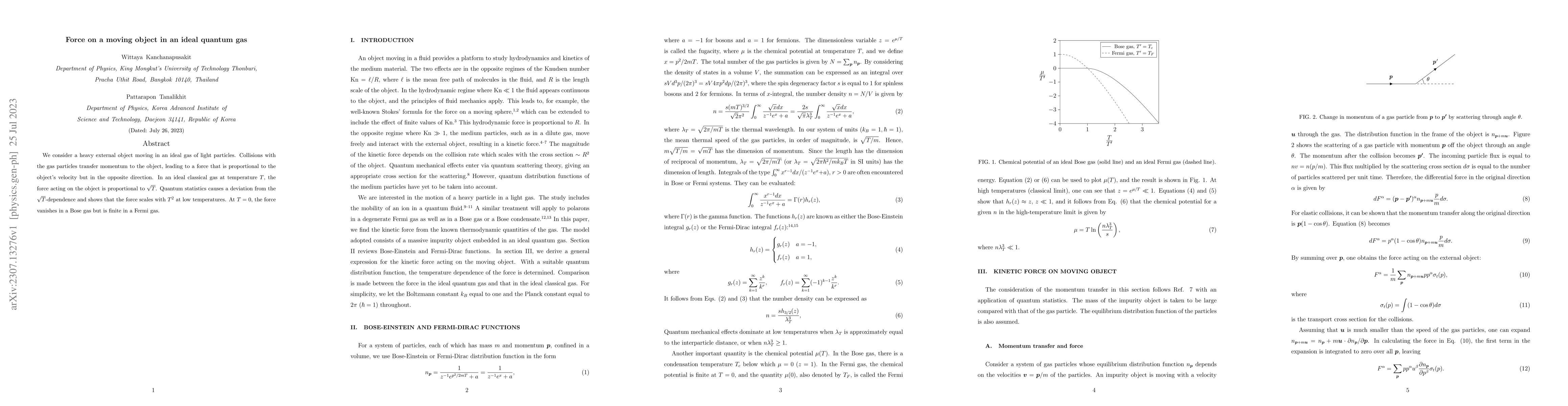 This paper investigates the force on a moving object in an ideal quantum gas, revealing that quantum statistics alters the classical $\sqrt{T}$-dependence to $T^2$ scaling at low temperatures. At $T=0$, the force disappears in a Bose gas but remains in a Fermi gas.
