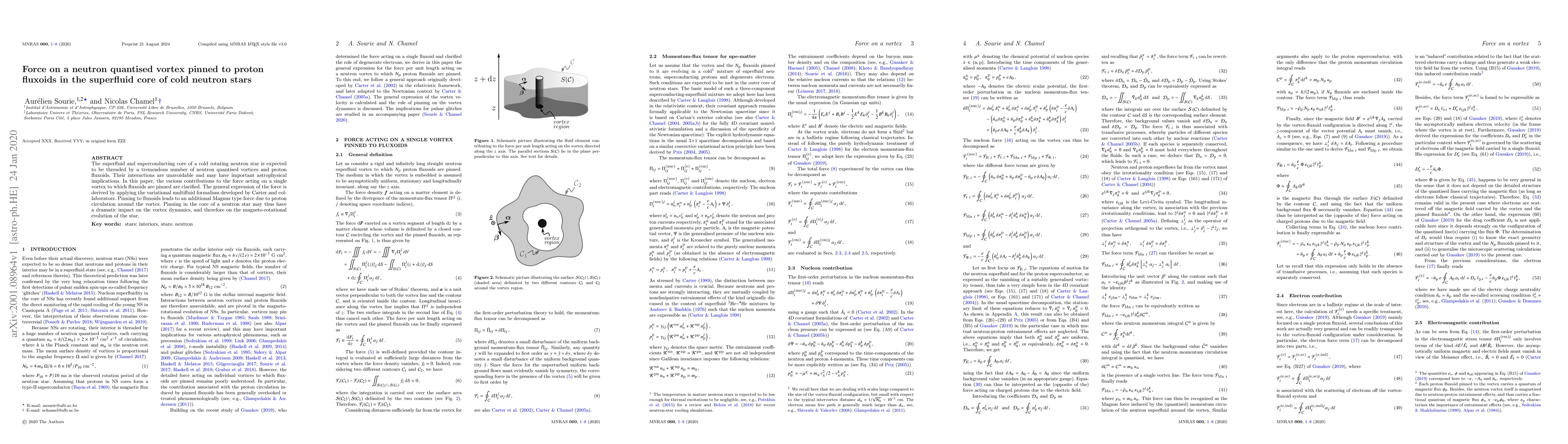 The superfluid and superconducting core of a cold rotating neutron star is expected to be threaded by a tremendous number of neutron quantised vortices and proton fluxoids. Their interactions are unavoidable and may have important astrophysical implications. In this paper, the various contributions to the force acting on a single vortex to which fluxoids are pinned are clarified. The general expression of the force is derived by applying the variational multifluid formalism developed by Carter and collaborators. Pinning to fluxoids leads to an additional Magnus type force due to proton circulation around the vortex. Pinning in the core of a neutron star may thus have a dramatic impact on the vortex dynamics, and therefore on the magneto-rotational evolution of the star.