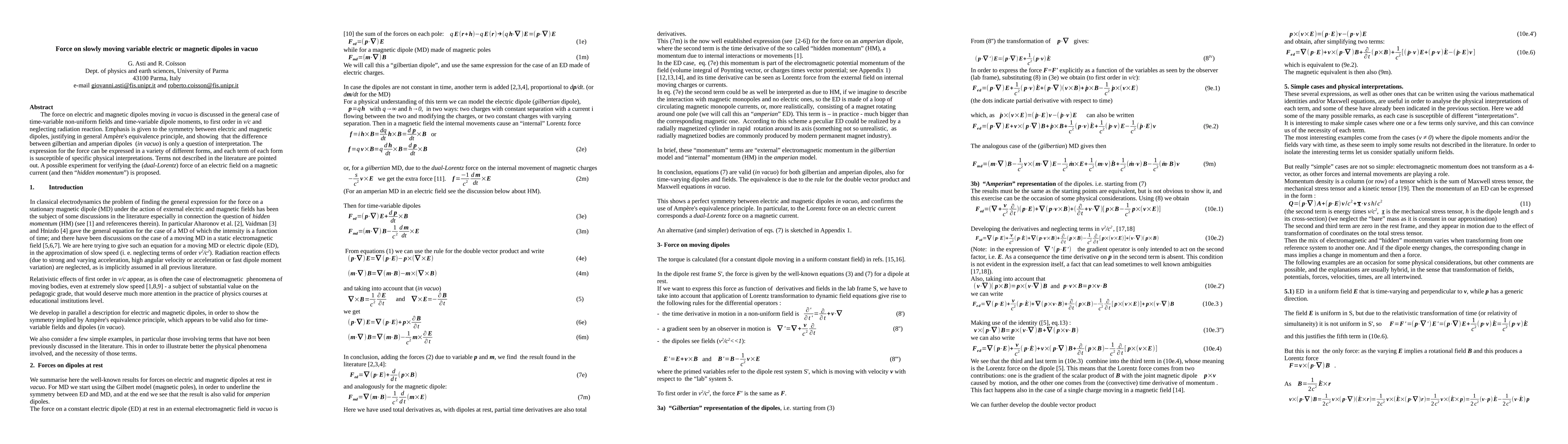 The force on electric and magnetic dipoles moving in vacuo is discussed in the general case of time-variable non-uniform fields and time-variable dipole moments, to first order in v/c and neglecting radiation reaction. Emphasis is given to the symmetry between electric and magnetic dipoles, justifying in general Amp\`ere's equivalence principle, and showing that the difference between gilbertian and amperian dipoles (in vacuo) is only a question of interpretation. The expression for the force can be expressed in a variety of different forms, and each term of each form is susceptible of specific physical interpretations. Terms not described in the literature are pointed out. A possible experiment for verifying the (dual-Lorentz) force of an electric field on a magnetic current (and then "hidden momentum") is proposed.