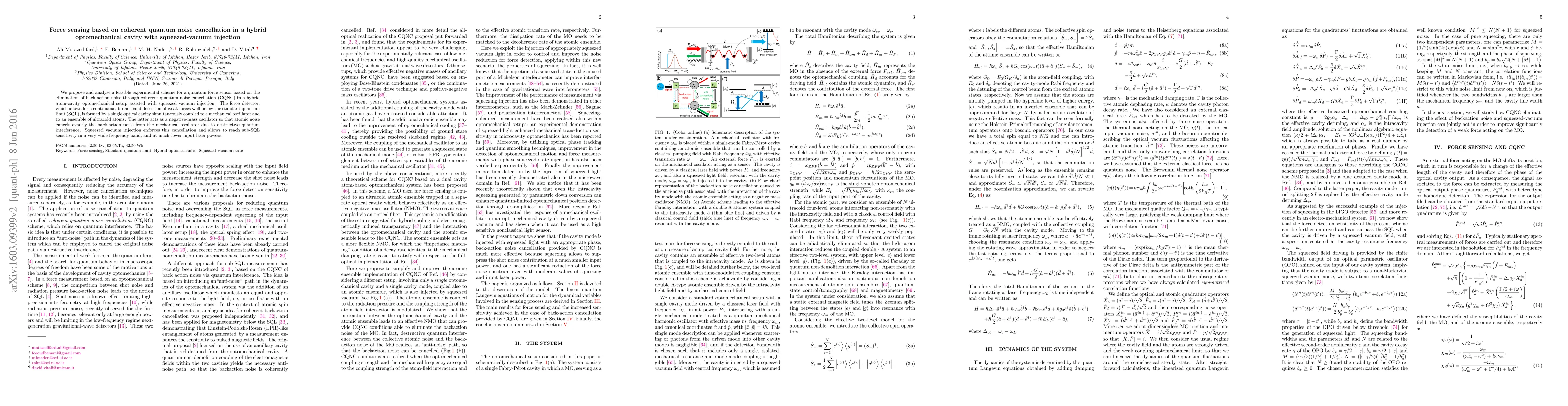 This paper proposes a quantum force sensor utilizing coherent quantum noise cancellation in a hybrid optomechanical cavity, where squeezed vacuum injection enhances sensitivity below the standard quantum limit. The setup involves a single optical cavity coupled to both a mechanical oscillator and an ensemble of ultracold atoms, achieving broad-band detection of weak forces.