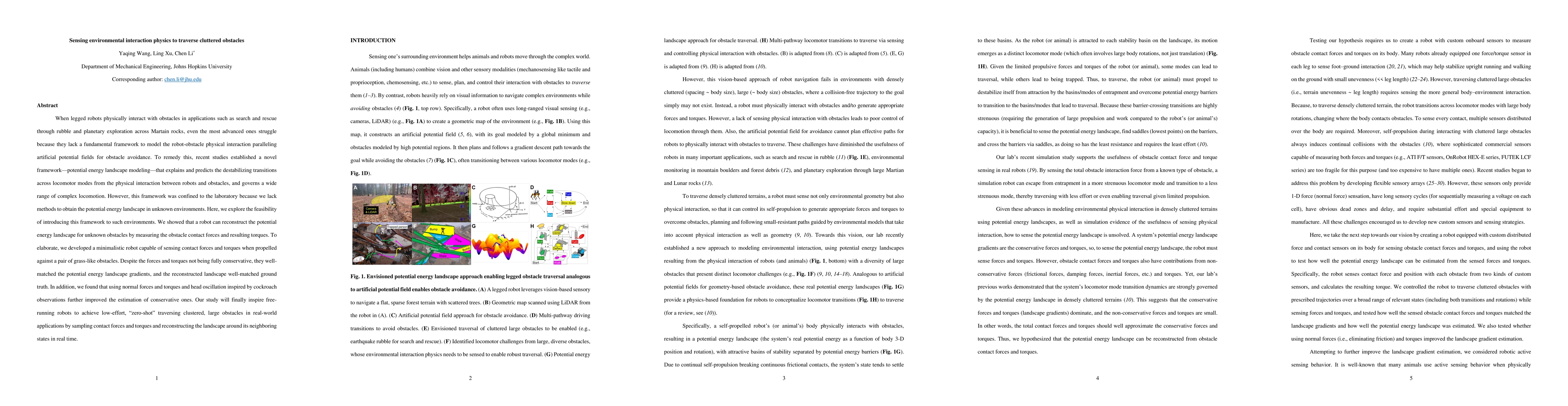 Visual sensing of environmental geometry allows robots to use artificial potential fields to avoid sparse obstacles. Yet robots must further traverse cluttered large obstacles for applications like search and rescue through rubble and planetary exploration across Martain rocks. Recent studies discovered that to traverse cluttered large obstacles, multi-legged insects and insect-inspired robots make strenuous transitions across locomotor modes with major changes in body orientation. When viewed on a potential energy landscape resulting from locomotor-obstacle physical interaction, these are barrier-crossing transitions across landscape basins. This potential energy landscape approach may provide a modeling framework for cluttered large obstacle traversal. Here, we take the next step toward this vision by testing whether force sensing allows the reconstruction of the potential energy landscape. We developed a cockroach-inspired, minimalistic robot capable of sensing obstacle contact forces and torques around its body as it propelled forward against a pair of cluttered grass-like beam obstacles. We performed measurements over many traverses with systematically varied body orientations. Despite the forces and torques not being fully conservative, they well-matched the potential energy landscape gradients and the landscape reconstructed from them well-matched ground truth. In addition, inspired by cockroach observations, we found that robot head oscillation during traversal further improved the accuracies of force sensing and landscape reconstruction. We still need to study how to reconstruct landscape during a single traverse, as in applications, robots have little chance to use multiple traverses to sample the environment systematically and how to find landscape saddles for least-effort transitions to traverse.