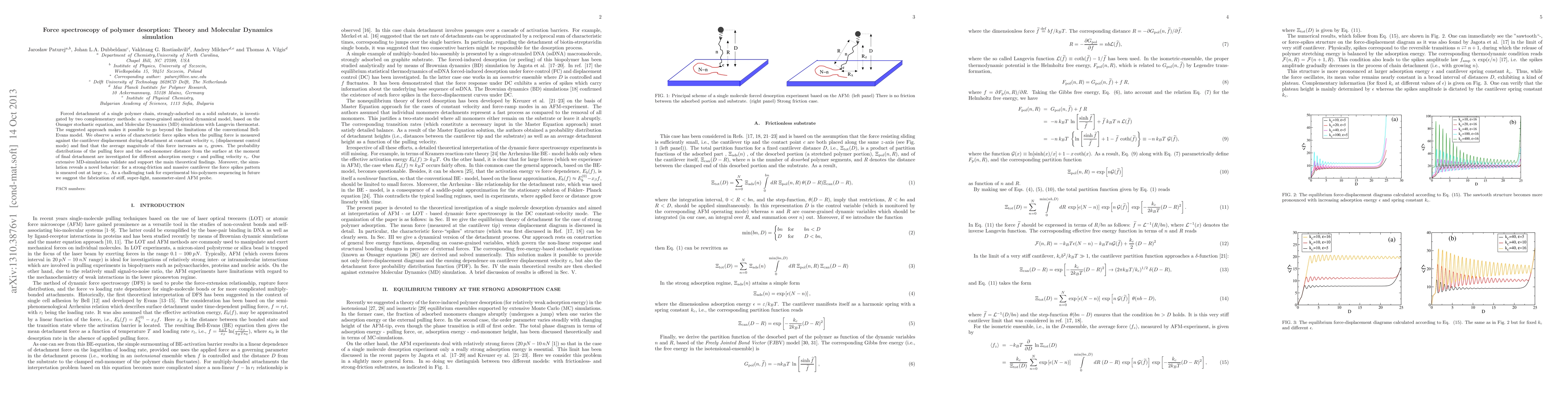 Forced detachment of a single polymer chain, strongly-adsorbed on a solid substrate, is investigated by two complementary methods: a coarse-grained analytical dynamical model, based on the Onsager stochastic equation, and Molecular Dynamics (MD) simulations with Langevin thermostat. The suggested approach makes it possible to go beyond the limitations of the conventional Bell-Evans model. We observe a series of characteristic force spikes when the pulling force is measured against the cantilever displacement during detachment at constant velocity $v_c$ (displacement control mode) and find that the average magnitude of this force increases as $v_c$ grows. The probability distributions of the pulling force and the end-monomer distance from the surface at the moment of final detachment are investigated for different adsorption energy $\epsilon$ and pulling velocity $v_c$. Our extensive MD-simulations validate and support the main theoretical findings. Moreover, the simulation reveals a novel behavior: for a strong-friction and massive cantilever the force spikes pattern is smeared out at large $v_c$. As a challenging task for experimental bio-polymers sequencing in future we suggest the fabrication of stiff, super-light, nanometer-sized AFM probe.