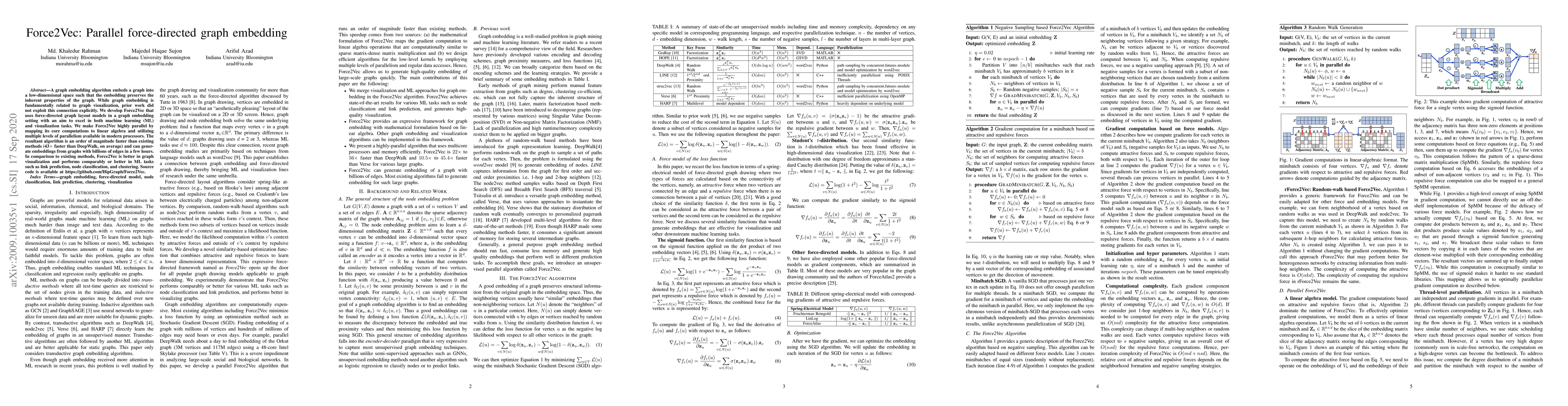 Force2Vec is a parallel force-directed graph embedding algorithm that leverages linear algebra for speed, achieving 43x faster performance than DeepWalk. It excels in both visualization and machine learning tasks, offering competitive results in link prediction, node classification, and clustering.
