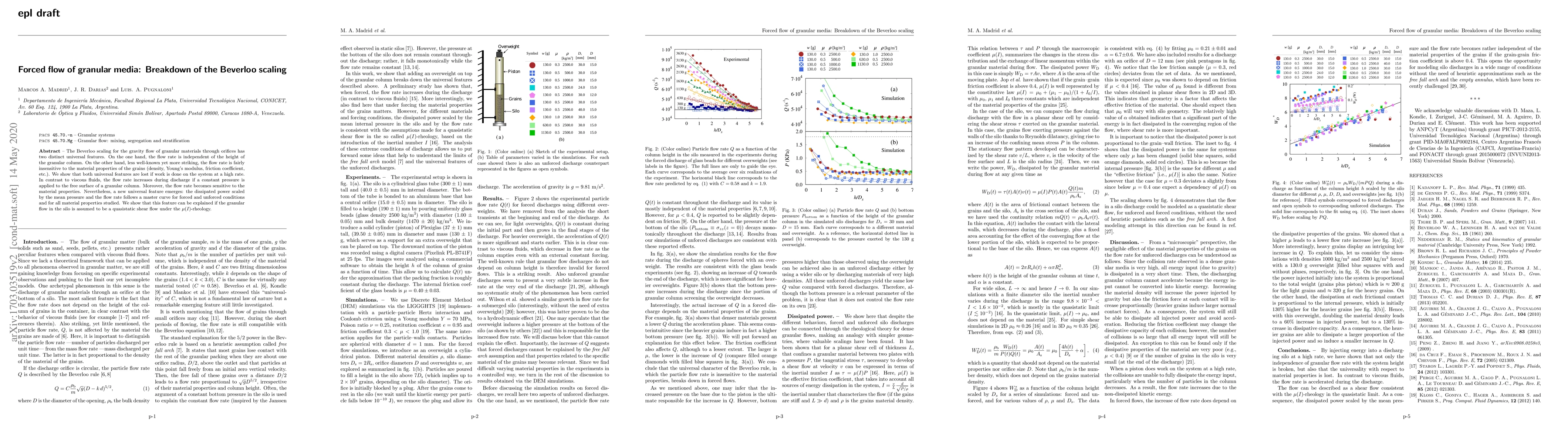 This paper investigates the breakdown of Beverloo scaling in forced granular flow, revealing that high-rate work disrupts the universal features of flow rate independence from column height and material properties. A new universal feature emerges where dissipated power scales with mean pressure and flow rate, explained by quasistatic shear flow under $\mu(I)$-rheology.