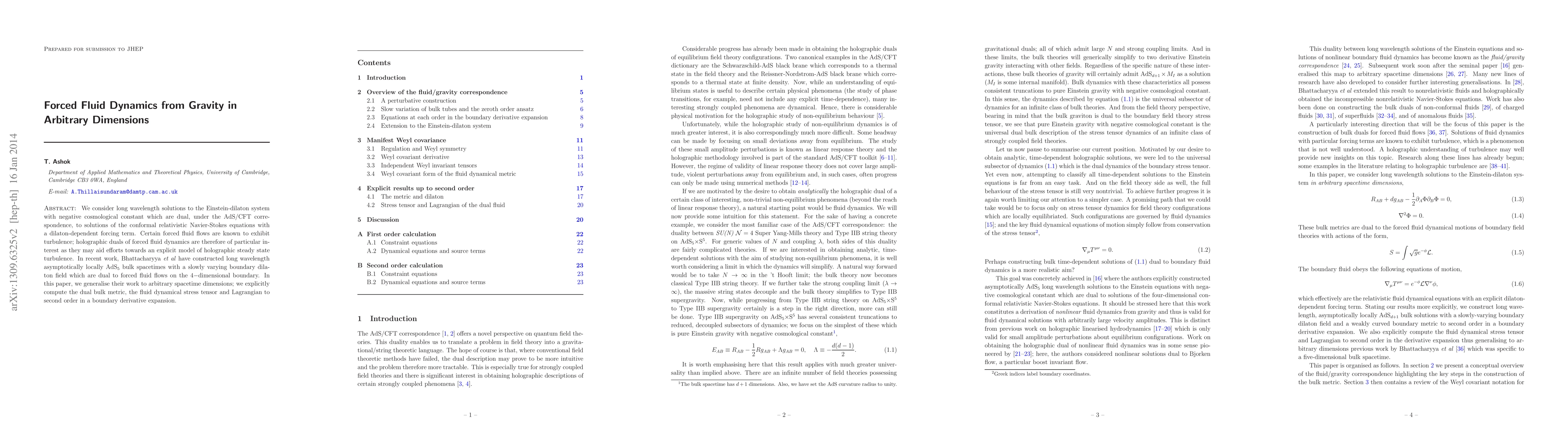 We consider long wavelength solutions to the Einstein-dilaton system with negative cosmological constant which are dual, under the AdS/CFT correspondence, to solutions of the conformal relativistic Navier-Stokes equations with a dilaton-dependent forcing term. Certain forced fluid flows are known to exhibit turbulence; holographic duals of forced fluid dynamics are therefore of particular interest as they may aid efforts towards an explicit model of holographic steady state turbulence. In recent work, Bhattacharyya et al have constructed long wavelength asymptotically locally AdS_5 bulk spacetimes with a slowly varying boundary dilaton field which are dual to forced fluid flows on the 4-dimensional boundary. In this paper, we generalise their work to arbitrary spacetime dimensions; we explicitly compute the dual bulk metric, the fluid dynamical stress tensor and Lagrangian to second order in a boundary derivative expansion.