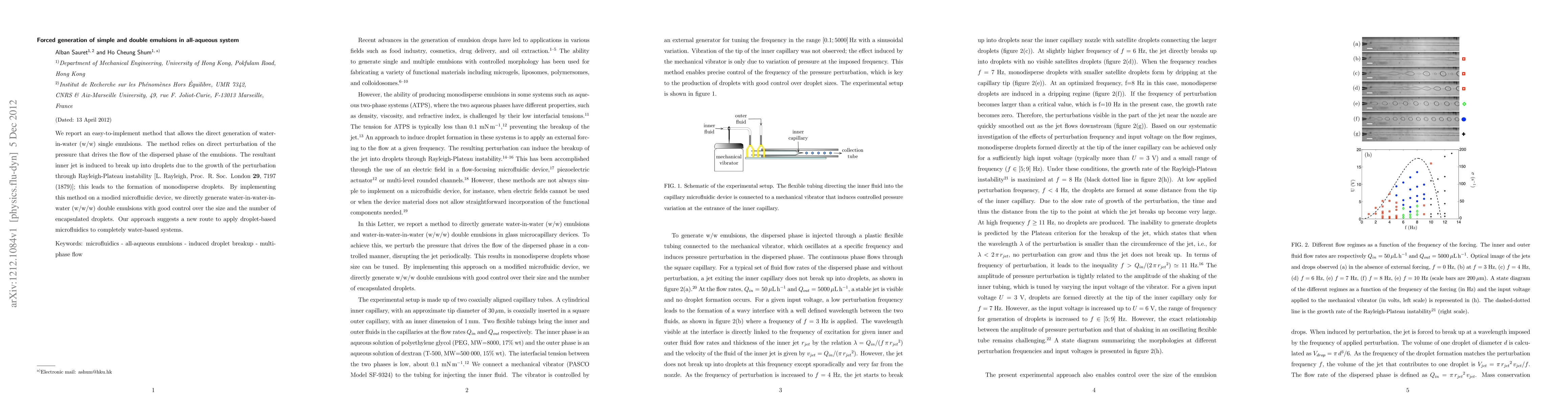 This paper presents an innovative method for generating monodisperse water-in-water (w/w) single emulsions and water-in-water-in-water (w/w/w) double emulsions using pressure-driven flow perturbations in a microfluidic device, leveraging Rayleigh-Plateau instability for droplet formation. The technique offers precise control over droplet size and number, opening new possibilities for water-based microfluidic systems.