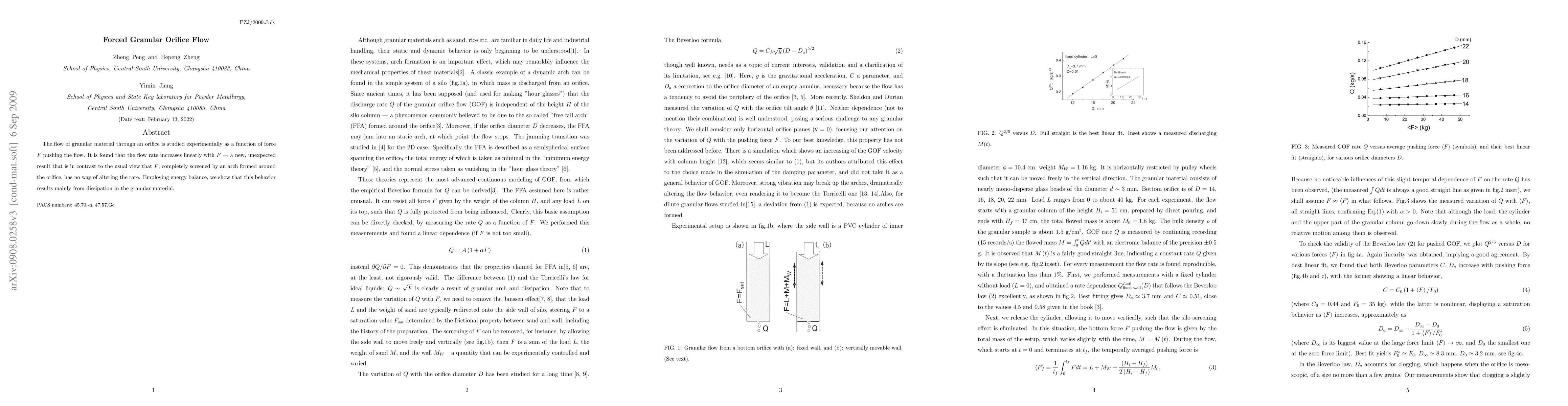 This study experimentally investigates granular flow through an orifice under varying forces, revealing a linear increase in flow rate with force, contrary to the traditional view. The observed behavior is primarily attributed to energy dissipation within the granular material.