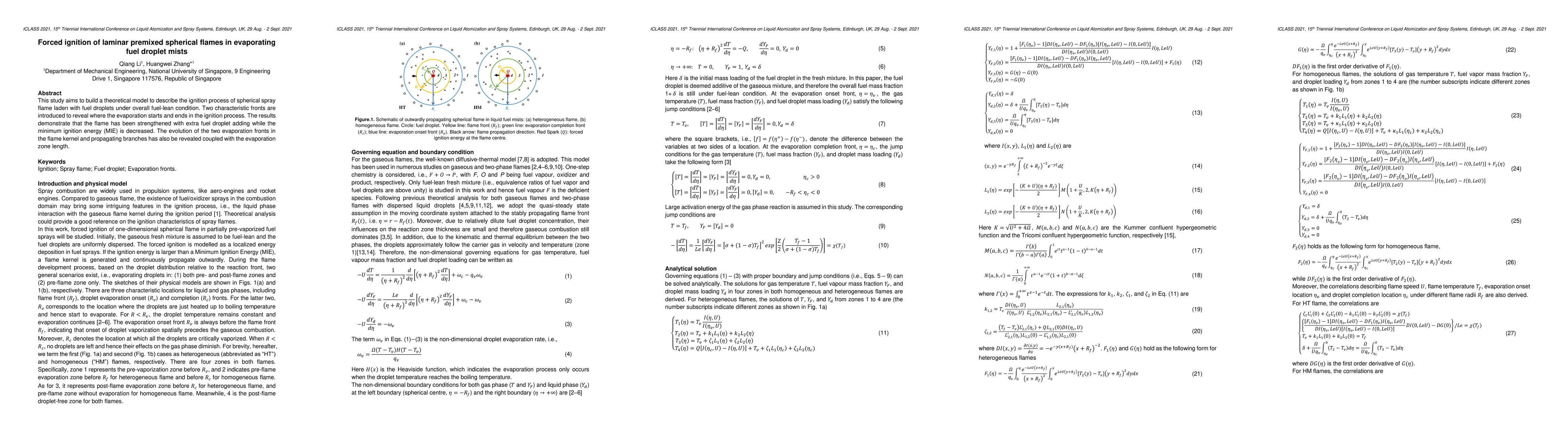 This research introduces a theoretical model to explain ignition in fuel-lean, droplet-laden spherical flames, identifying two key evaporation fronts. The findings show increased flame strength and decreased minimum ignition energy with added droplets, alongside the evolution of evaporation fronts in flame kernels and branches.