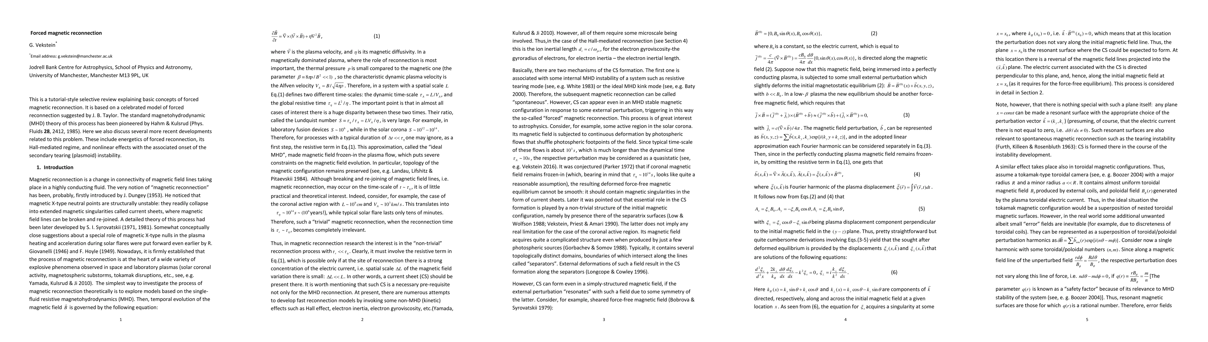 This tutorial-style review explores forced magnetic reconnection in magnetohydrodynamics, discussing key concepts, recent developments, and nonlinear effects. It sheds light on the process's energetics, Hall-mediated regime, and associated instabilities.