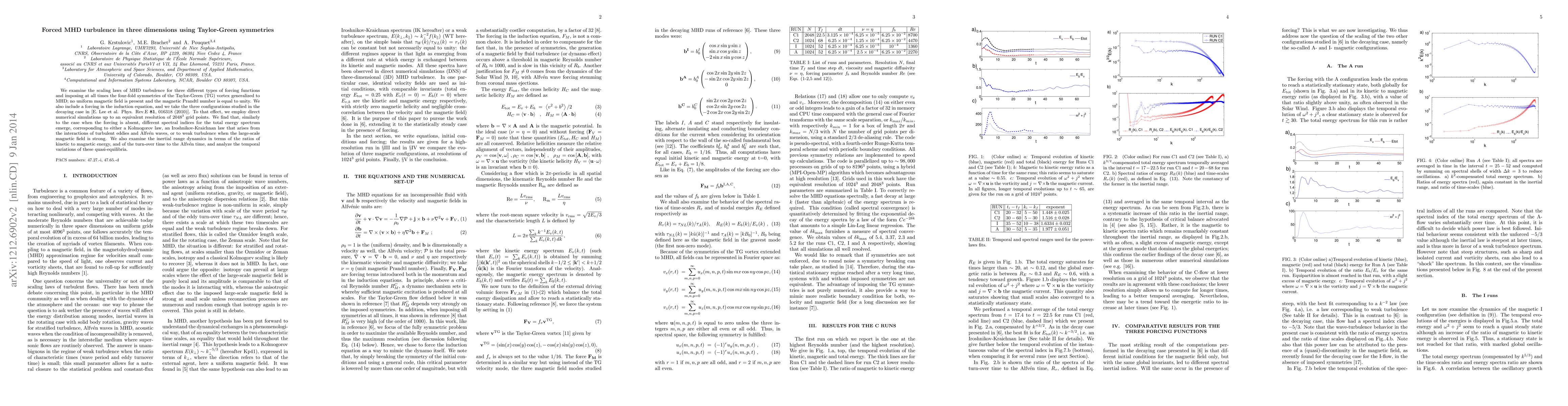 We examine the scaling laws of MHD turbulence for three different types of forcing functions and imposing at all times the four-fold symmetries of the Taylor-Green (TG) vortex generalized to MHD; no uniform magnetic field is present and the magnetic Prandtl number is equal to unity. We also include a forcing in the induction equation, and we take the three configurations studied in the decaying case in [E. Lee et al. Phys. Rev.E {\bf 81}, 016318 (2010)]. To that effect, we employ direct numerical simulations up to an equivalent resolution of $2048^3$ grid points. We find that, similarly to the case when the forcing is absent, different spectral indices for the total energy spectrum emerge, corresponding to either a Kolmogorov law, an Iroshnikov-Kraichnan law that arises from the interactions of turbulent eddies and Alfv\'en waves, or to weak turbulence when the large-scale magnetic field is strong. We also examine the inertial range dynamics in terms of the ratios of kinetic to magnetic energy, and of the turn-over time to the Alfv\'en time, and analyze the temporal variations of these quasi-equilibria.