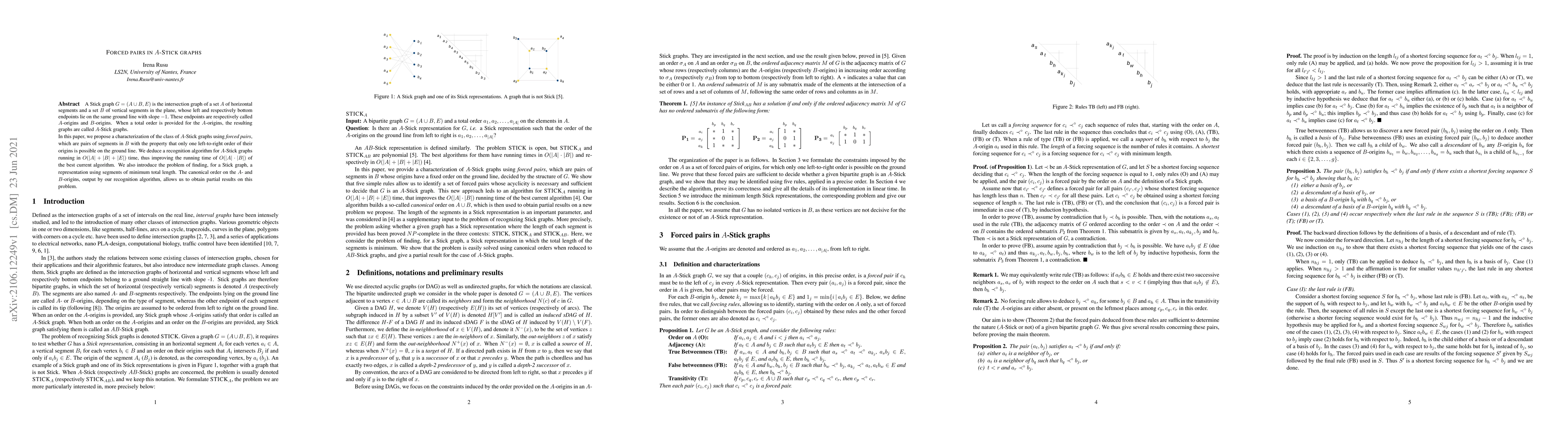 A Stick graph G=(A\cup B, E) is the intersection graph of a set A of horizontal segments and a set B of vertical segments in the plane, whose left and respectively bottom endpoints lie on the same ground line with slope -1. These endpoints are respectively called A-origins and B-origins. When a total order is provided for the A-origins, the resulting graphs are called A-Stick graphs. In this paper, we propose a characterization of the class of A-Stick graphs using forced pairs, which are pairs of segments in B with the property that only one left-to-right order of their origins is possible on the ground line. We deduce a recognition algorithm for A-Stick graphs running in O(|A|+|B|+|E|) time, thus improving the running time of O(|A|\cdot |B|) of the best current algorithm. We also introduce the problem of finding, for a Stick graph, a representation using segments of minimum total length. The canonical order on the A- and B-origins, output by our recognition algorithm, allows us to obtain partial results on this problem.