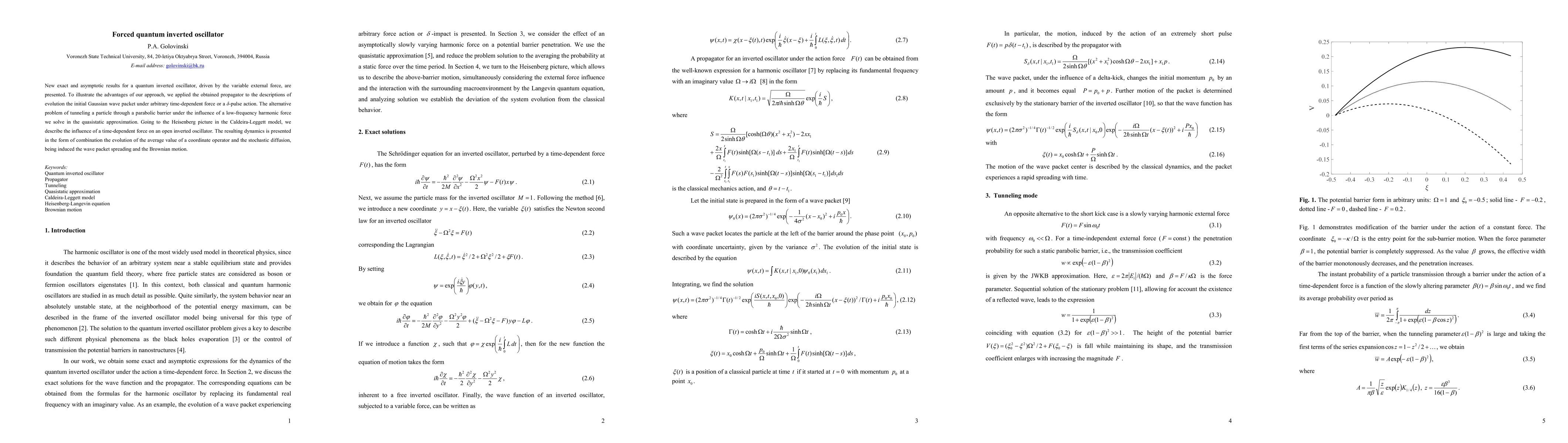 The paper presents new results on a quantum inverted oscillator driven by a variable external force, illustrating exact and asymptotic solutions for the propagator that can be applied to various scenarios, including wave packet evolution under time-dependent forces and tunneling through parabolic barriers.