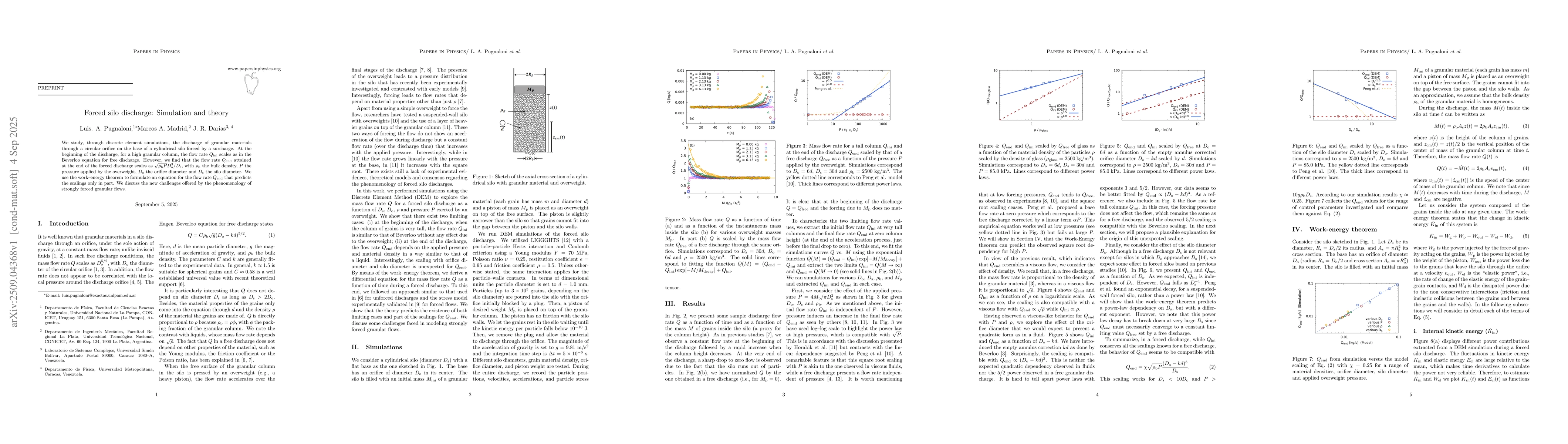 We study, through discrete element simulations, the discharge of granular materials through a circular orifice on the base of a cylindrical silo forced by a surcharge. At the beginning of the discharge, for a high granular column, the flow rate $Q_{\rm ini}$ scales as in the Beverloo equation for free discharge. However, we find that the flow rate $Q_{\rm end}$ attained at the end of the forced discharge scales as $\sqrt{\rho_b P}D_o^3/D_s$, with $\rho_b$ the bulk density, $P$ the pressure applied by the overweight, $D_o$ the orifice diameter and $D_s$ the silo diameter. We use the work$-$energy theorem to formulate an equation for the flow rate $Q_{\rm end}$ that predicts the scalings only in part. We discuss the new challenges offered by the phenomenology of strongly forced granular flows.