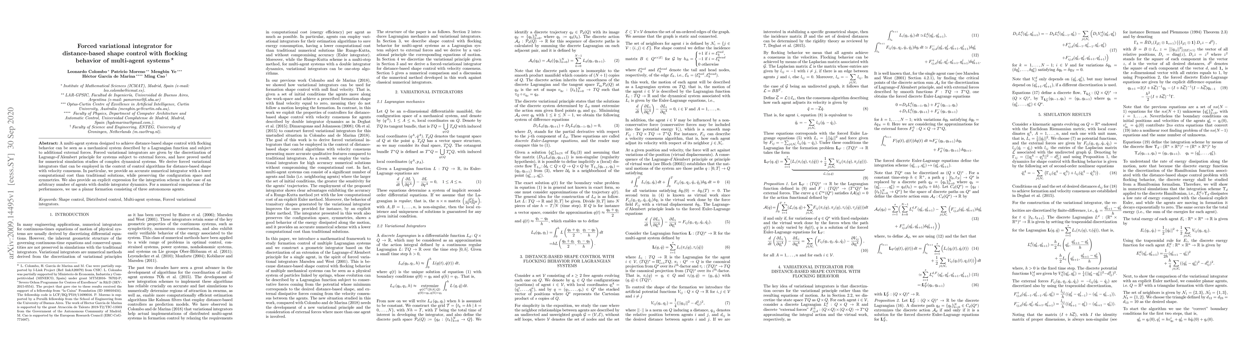 The method is based on forced variational integrators, which provide accurate results while reducing computational cost, and can be applied to arbitrary numbers of agents.