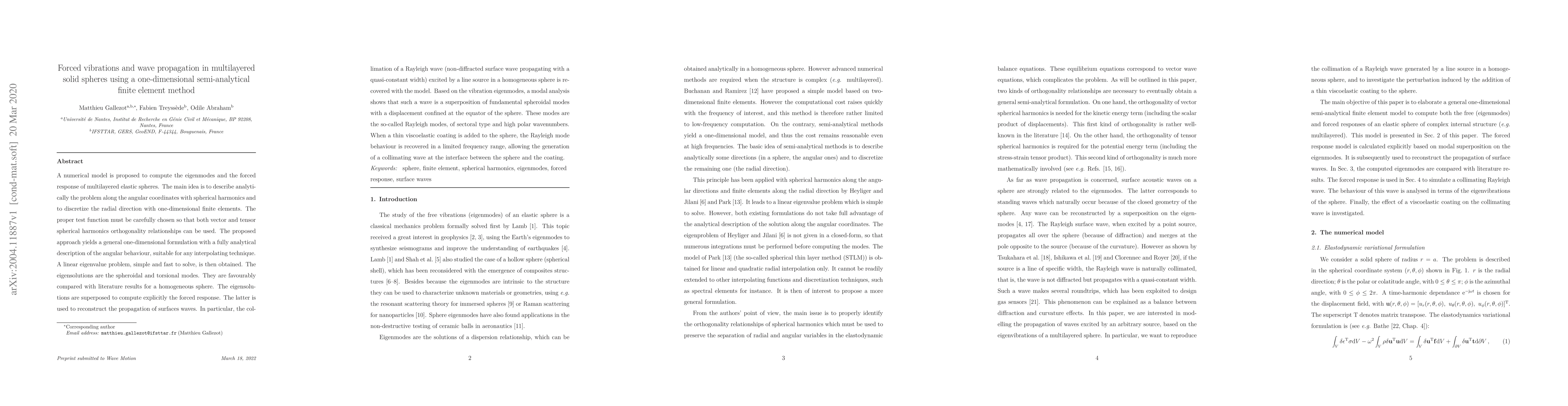 A numerical model is proposed to compute the eigenmodes and the forced response of multilayered elastic spheres. The main idea is to describe analytically the problem along the angular coordinates with spherical harmonics and to discretize the radial direction with one-dimensional finite elements. The proper test function must be carefully chosen so that both vector and tensor spherical harmonics orthogonality relationships can be used. The proposed approach yields a general one-dimensional formulation with a fully analytical description of the angular behaviour, suitable for any interpolating technique. A linear eigenvalue problem, simple and fast to solve, is then obtained. The eigensolutions are the spheroidal and torsional modes. They are favourably compared with literature results for a homogeneous sphere. The eigensolutions are superposed to compute explicitly the forced response. The latter is used to reconstruct the propagation of surfaces waves. In particular, the collimation of a Rayleigh wave (non-diffracted surface wave propagating with a quasi-constant width) excited by a line source in a homogeneous sphere is recovered with the model. Based on the vibration eigenmodes, a modal analysis shows that such a wave is a superposition of fundamental spheroidal modes with a displacement confined at the equator of the sphere. These modes are the so-called Rayleigh modes, of sectoral type and high polar wavenumbers. When a thin viscoelastic coating is added to the sphere, the Rayleigh mode behaviour is recovered in a limited frequency range, allowing the generation of a collimating wave at the interface between the sphere and the coating.
