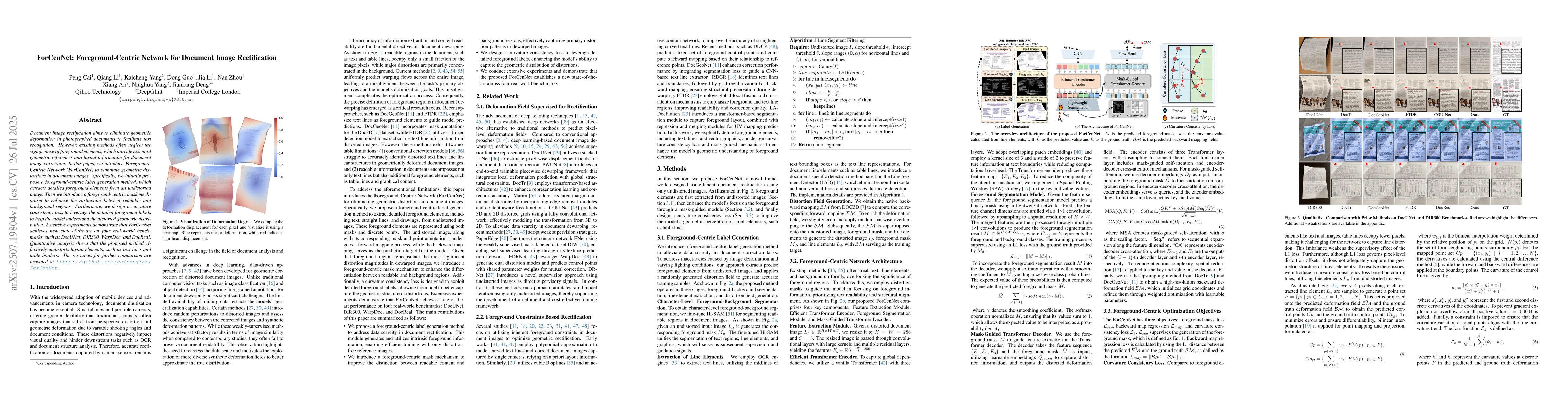 Document image rectification aims to eliminate geometric deformation in photographed documents to facilitate text recognition. However, existing methods often neglect the significance of foreground elements, which provide essential geometric references and layout information for document image correction. In this paper, we introduce Foreground-Centric Network (ForCenNet) to eliminate geometric distortions in document images. Specifically, we initially propose a foreground-centric label generation method, which extracts detailed foreground elements from an undistorted image. Then we introduce a foreground-centric mask mechanism to enhance the distinction between readable and background regions. Furthermore, we design a curvature consistency loss to leverage the detailed foreground labels to help the model understand the distorted geometric distribution. Extensive experiments demonstrate that ForCenNet achieves new state-of-the-art on four real-world benchmarks, such as DocUNet, DIR300, WarpDoc, and DocReal. Quantitative analysis shows that the proposed method effectively undistorts layout elements, such as text lines and table borders. The resources for further comparison are provided at https://github.com/caipeng328/ForCenNet.