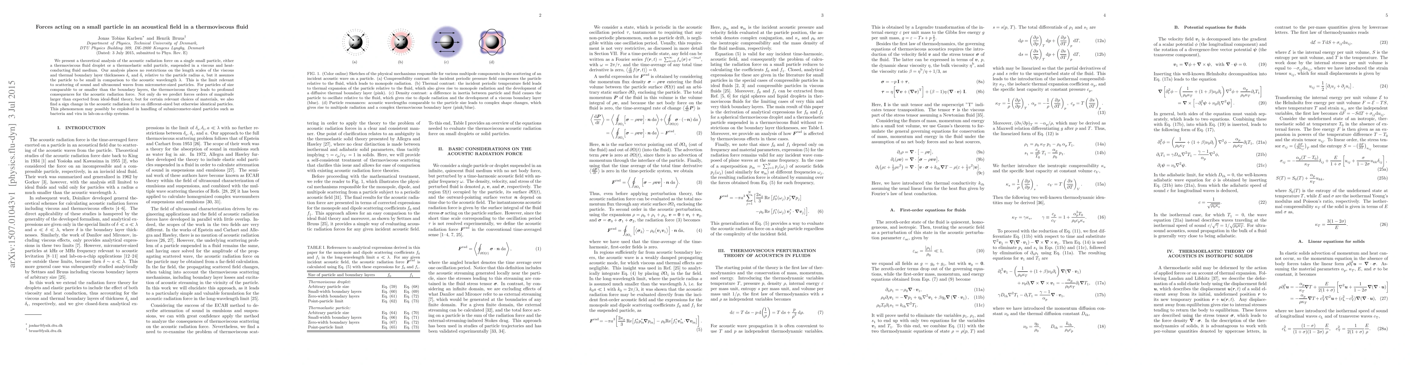 This paper theoretically analyzes the acoustic radiation force on small thermoviscous fluid droplets or thermoelastic solid particles in a viscous fluid, revealing forces much larger than predicted by ideal-fluid theory, potentially useful for manipulating submicrometer particles in lab-on-a-chip systems.