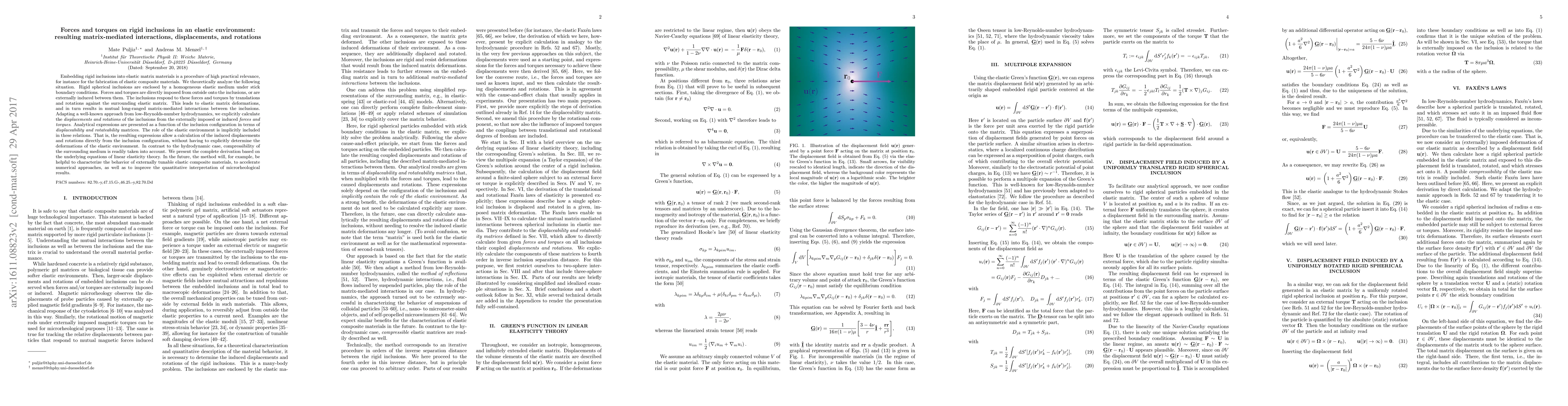 This paper theoretically analyzes the forces and torques on rigid spherical inclusions embedded in an elastic matrix, deriving analytical expressions for their displacements and rotations due to external forces and torques. The method accounts for matrix-mediated interactions and compressibility, providing a useful tool for characterizing elastic composite materials and interpreting microrheological results.