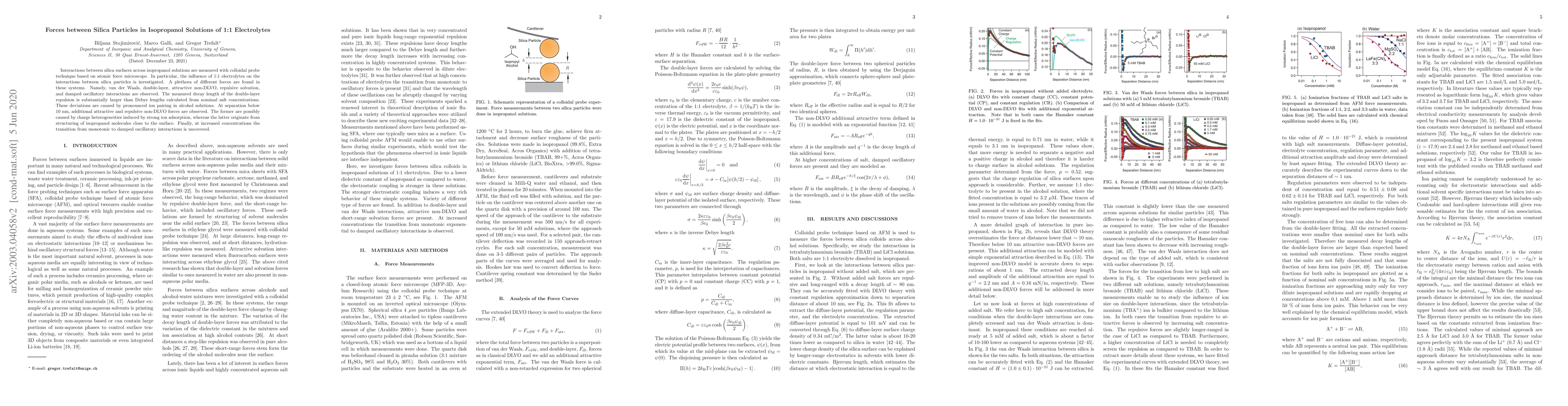 Interactions between silica surfaces across isopropanol solutions are measured with colloidal probe technique based on atomic force microscope. In particular, the influence of 1:1 electrolytes on the interactions between silica particles is investigated. A plethora of different forces are found in these systems. Namely, van der Waals, double-layer, attractive non-DLVO, repulsive solvation, and damped oscillatory interactions are observed. The measured decay length of the double-layer repulsion is substantially larger than Debye lengths calculated from nominal salt concentrations. These deviations are caused by pronounced ion pairing in alcohol solutions. At separation below 10 nm, additional attractive and repulsive non-DLVO forces are observed. The former are possibly caused by charge heterogeneities induced by strong ion adsorption, whereas the latter originate from structuring of isopropanol molecules close to the surface. Finally, at increased concentrations the transition from monotonic to damped oscillatory interactions is uncovered.