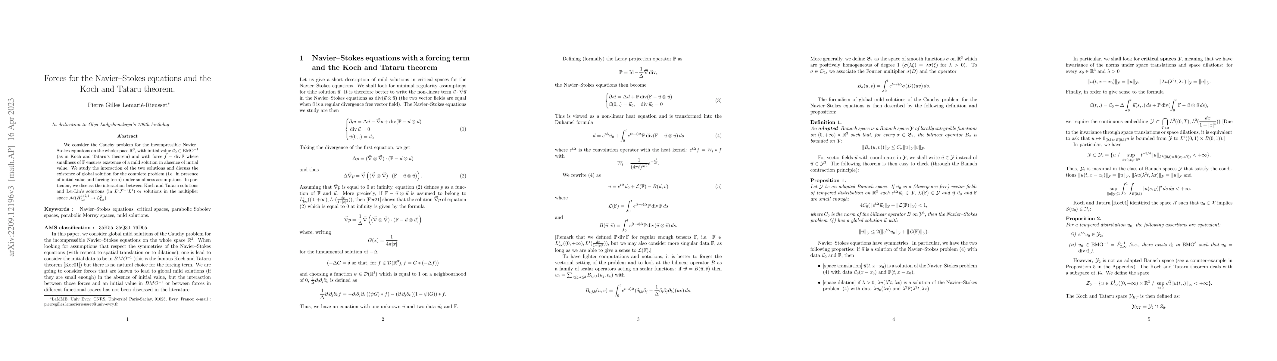 We consider the Cauchy problem for the incompressible Navier--Stokes equations on the whole space $\mathbb{R}^3$, with initial value $\vec u_0\in {\rm BMO}^{-1}$ (as in Koch and Tataru's theorem) and with force $\vec f=\Div \mathbb{F}$ where smallness of $\mathbb{F}$ ensures existence of a mild solution in absence of initial value. We study the interaction of the two solutions and discuss the existence of global solution for the complete problem (i.e. in presence of initial value and forcing term) under smallness assumptions. In particular, we discuss the interaction between Koch and Tataru solutions and Lei-Lin's solutions (in $L^2\mathcal{F}^{-1}L^1$) or solutions in the multiplier space $\mathcal{M}(\dot H^{1/2,1}_{t,x}\mapsto L^2_{t,x})$.