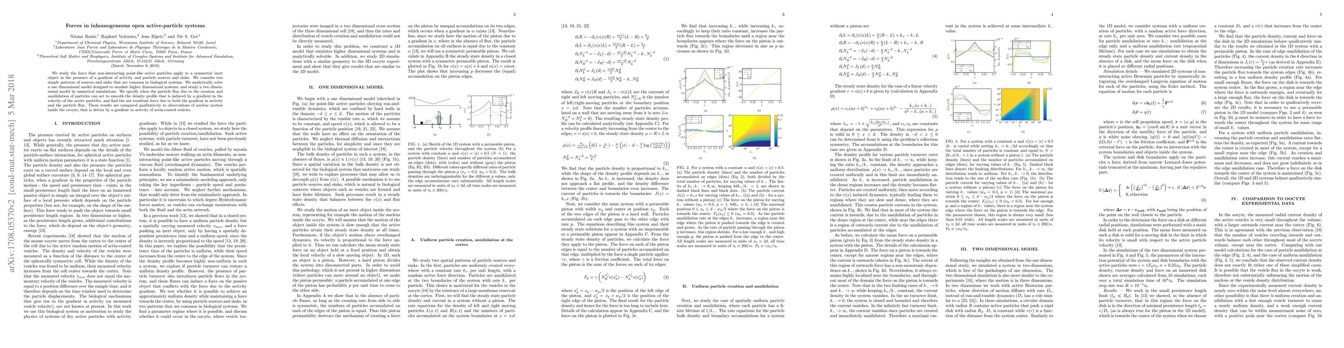 This paper investigates the forces exerted by non-interacting active particles on an inert object in systems with activity gradients and particle sources/sinks, using both analytical and numerical methods. It finds conditions under which particle flux can smooth density profiles and determines the resultant force, comparing these findings to biological observations of nuclear motion in oocytes.