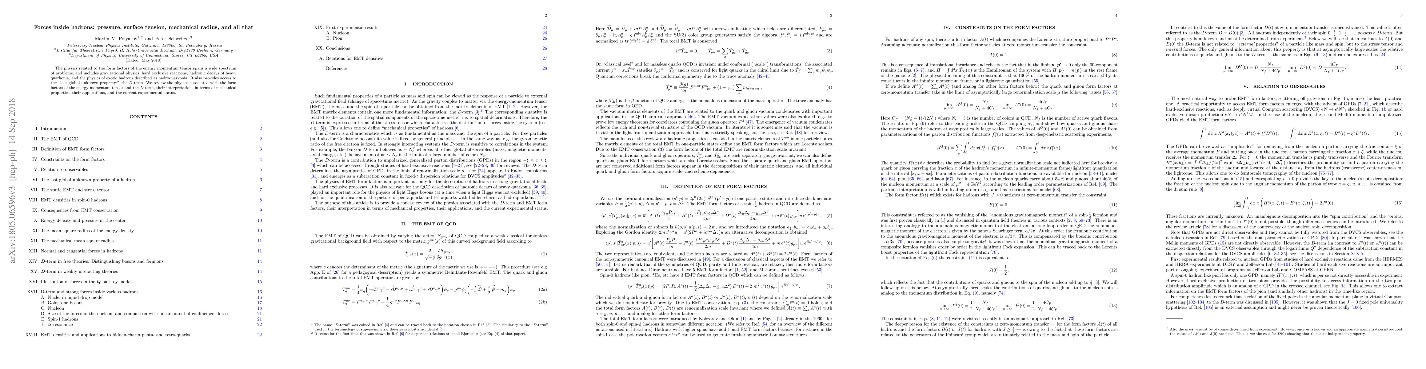 This paper reviews the physics of hadron form factors, including pressure, surface tension, mechanical radius, and the D-term, with implications for experiments in particle physics and gravitational physics.