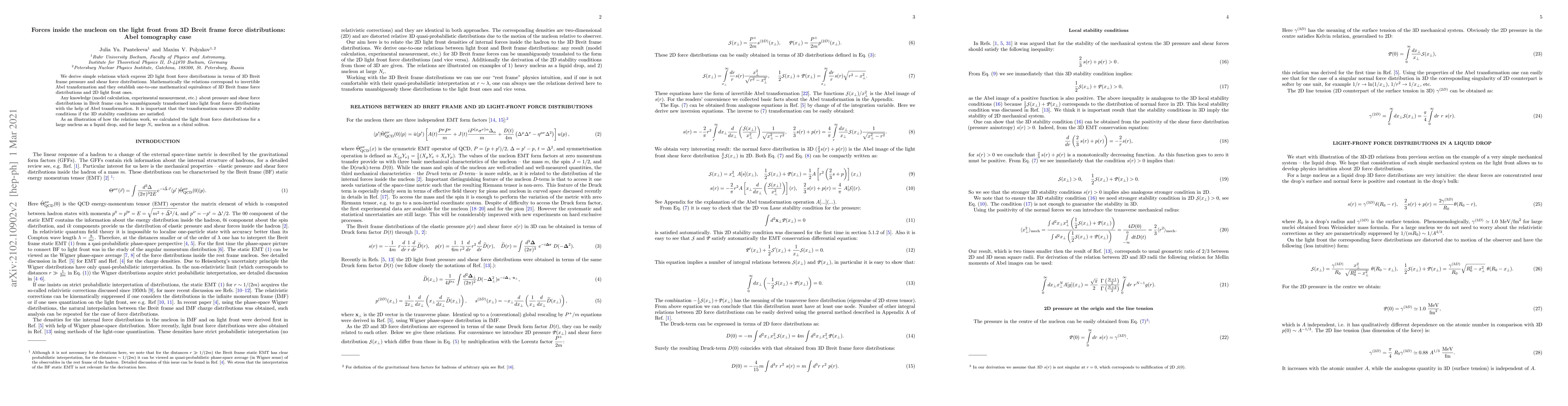 This paper derives relations to transform 3D Breit frame force distributions into 2D light front force distributions using Abel tomography, ensuring stability conditions are met. It demonstrates the method with calculations for a liquid drop nucleus and a chiral soliton nucleon.