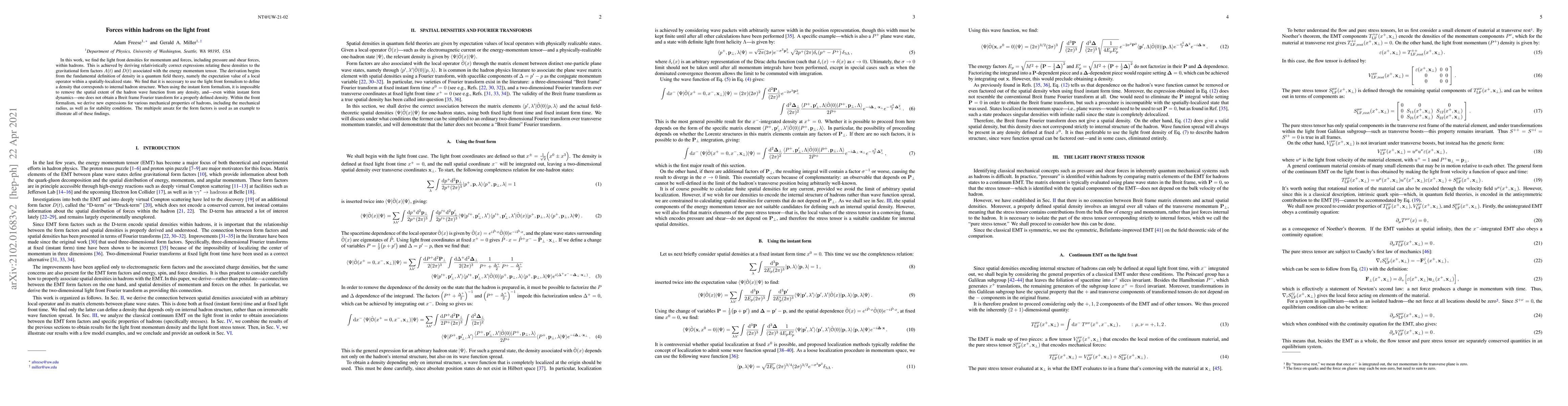 In this work, we find the light front densities for momentum and forces, including pressure and shear forces, within hadrons. This is achieved by deriving relativistically correct expressions relating these densities to the gravitational form factors $A(t)$ and $D(t)$ associated with the energy momentum tensor. The derivation begins from the fundamental definition of density in a quantum field theory, namely the expectation value of a local operator within a spatially-localized state. We find that it is necessary to use the light front formalism to define a density that corresponds to internal hadron structure. When using the instant form formalism, it is impossible to remove the spatial extent of the hadron wave function from any density, and -- even within instant form dynamics -- one does not obtain a Breit frame Fourier transform for a properly defined density. Within the front formalism, we derive new expressions for various mechanical properties of hadrons, including the mechanical radius, as well as for stability conditions. The multipole ansatz for the form factors is used as an example to illustrate all of these findings.