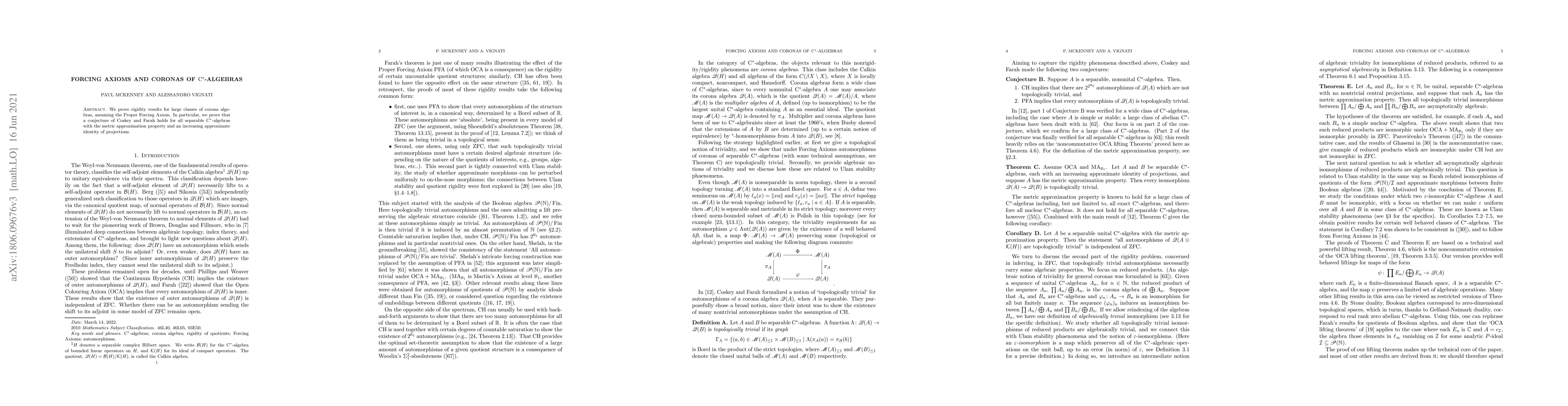 This paper proves rigidity results for large classes of corona $C^*$-algebras under the Proper Forcing Axiom, holding a conjecture about separable algebras with specific properties.
