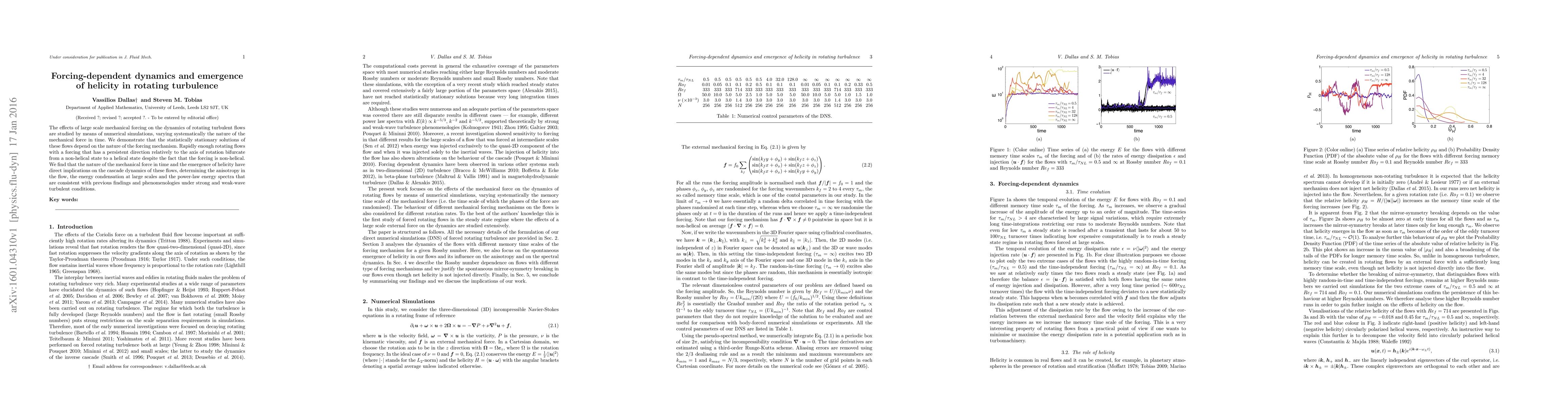 The effects of large scale mechanical forcing on the dynamics of rotating turbulent flows are studied by means of numerical simulations, varying systematically the nature of the mechanical force in time. We demonstrate that the statistically stationary solutions of these flows depend on the nature of the forcing mechanism. Rapidly enough rotating flows with a forcing that has a persistent direction relatively to the axis of rotation bifurcate from a non-helical state to a helical state despite the fact that the forcing is non-helical. We find that the nature of the mechanical force in time and the emergence of helicity have direct implications on the cascade dynamics of these flows, determining the anisotropy in the flow, the energy condensation at large scales and the power-law energy spectra that are consistent with previous findings and phenomenologies under strong and weak-wave turbulent conditions.