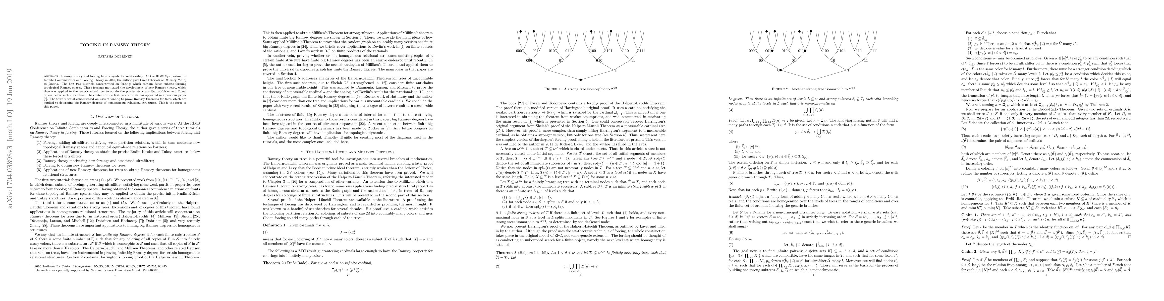 This paper explores the interplay between Ramsey theory and forcing, particularly focusing on the use of forcing to prove Ramsey theorems for trees and determine the big Ramsey degrees of homogeneous relational structures, building on prior developments in the precise structure of generic ultrafilters.