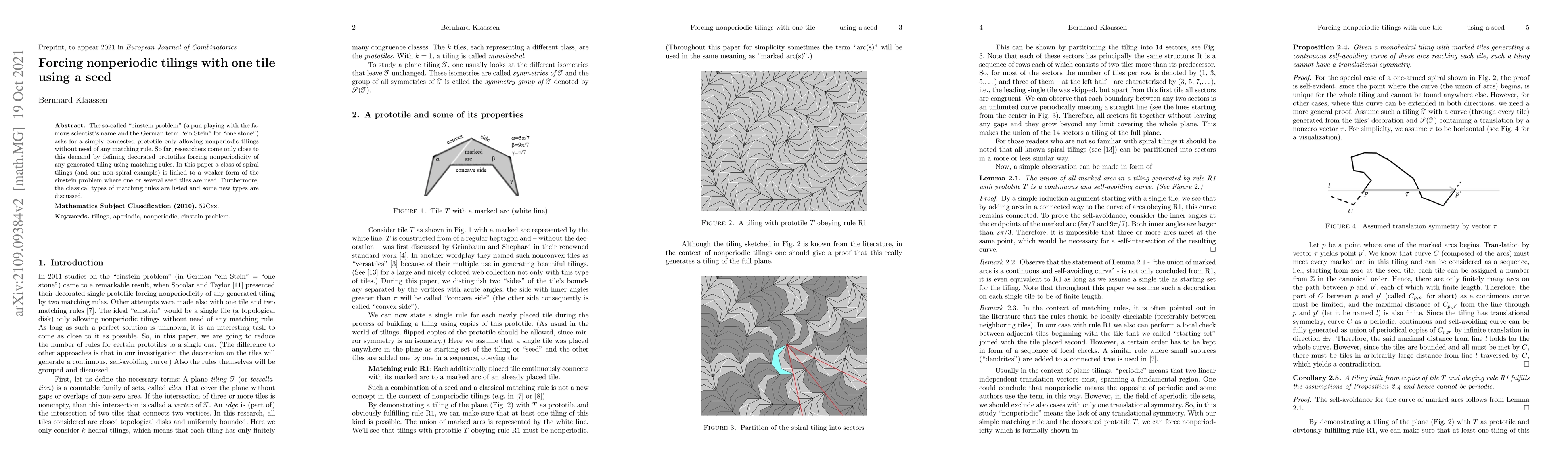 The research explores nonperiodic tilings using a single prototile with the assistance of one or several seed tiles, linking this to a weaker form of the Einstein problem. It also discusses various types of matching rules, including new types, and presents examples such as spiral tilings and a non-spiral example.