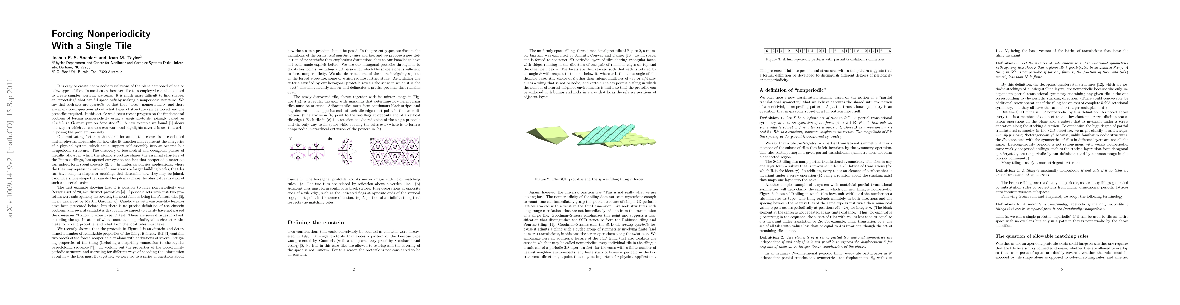 An aperiodic prototile is a shape for which infinitely many copies can be arranged to fill Euclidean space completely with no overlaps, but not in a periodic pattern. Tiling theorists refer to such a prototile as an "einstein" (a German pun on "one stone"). The possible existence of an einstein has been pondered ever since Berger's discovery of large set of prototiles that in combination can tile the plane only in a nonperiodic way. In this article we review and clarify some features of a prototile we recently introduced that is an einstein according to a reasonable definition. [This abstract does not appear in the published article.]