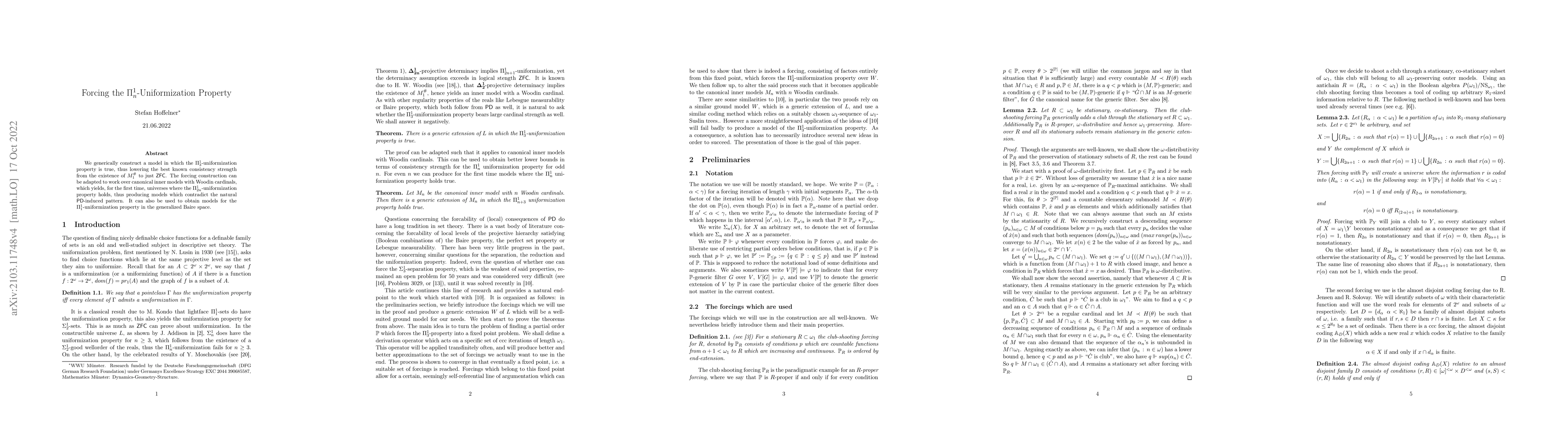 This paper constructs a model where the $\Pi^1_3$-uniformization property holds, reducing the required consistency strength from $M_1^{\#}$ to $\mathsf{ZFC}$. The method can also generate models with $\Pi^1_{2n}$-uniformization for $n > 1$, contradicting typical $\mathsf{PD}$ patterns, and models for $\Pi^1_1$-uniformization in the generalized Baire space.