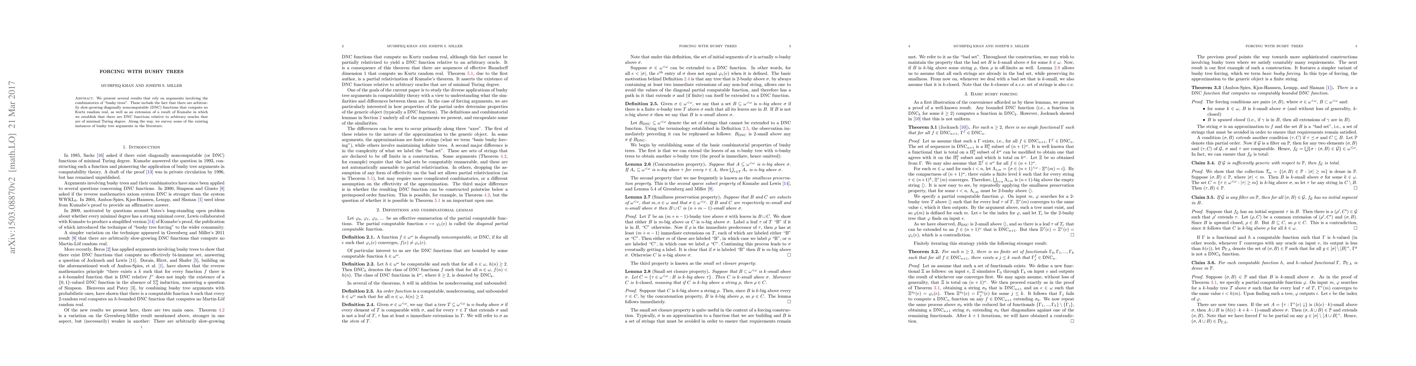 We present several results that rely on arguments involving the combinatorics of "bushy trees". These include the fact that there are arbitrarily slow-growing diagonally noncomputable (DNC) functions that compute no Kurtz random real, as well as an extension of a result of Kumabe in which we establish that there are DNC functions relative to arbitrary oracles that are of minimal Turing degree. Along the way, we survey some of the existing instances of bushy tree arguments in the literature.