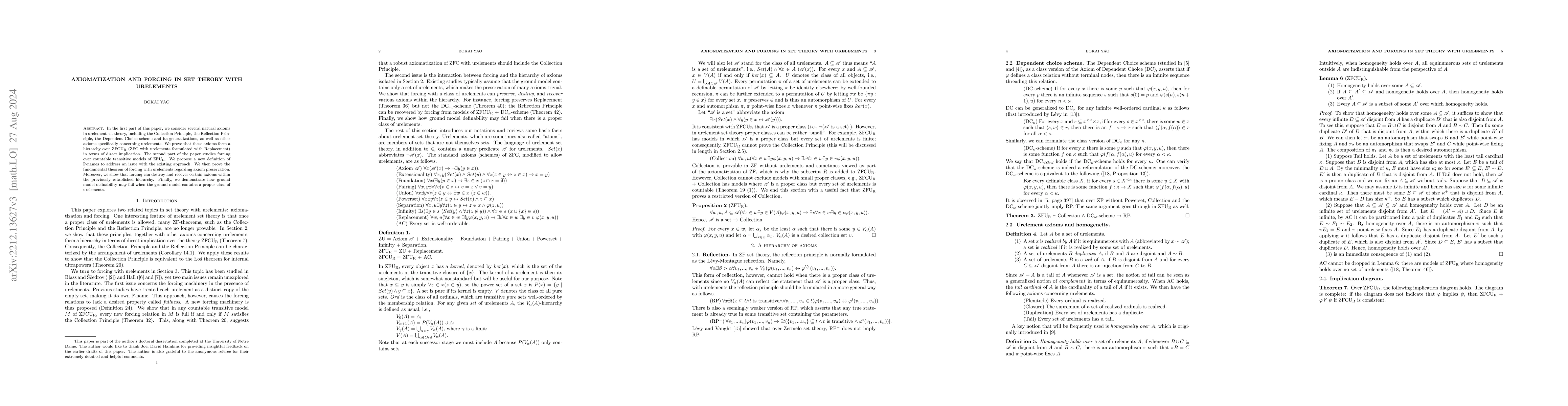 I first isolate a hierarchy of axioms over ZFC that allows a proper class of urelements. The Collection Principle and Reflection Principle hold precisely when the urelements are arranged in a specific manner. I then turn to forcing with urelements. A new forcing machinery with urelements is proposed to address a problem with the existing approach regarding the property of fullness. Every new forcing relation is full just in case Collection holds in the ground model. Forcing with urelements can preserve, destroy, or recover various axioms within the hierarchy. Ground model definability fails when the ground model contains a proper class of urelements.