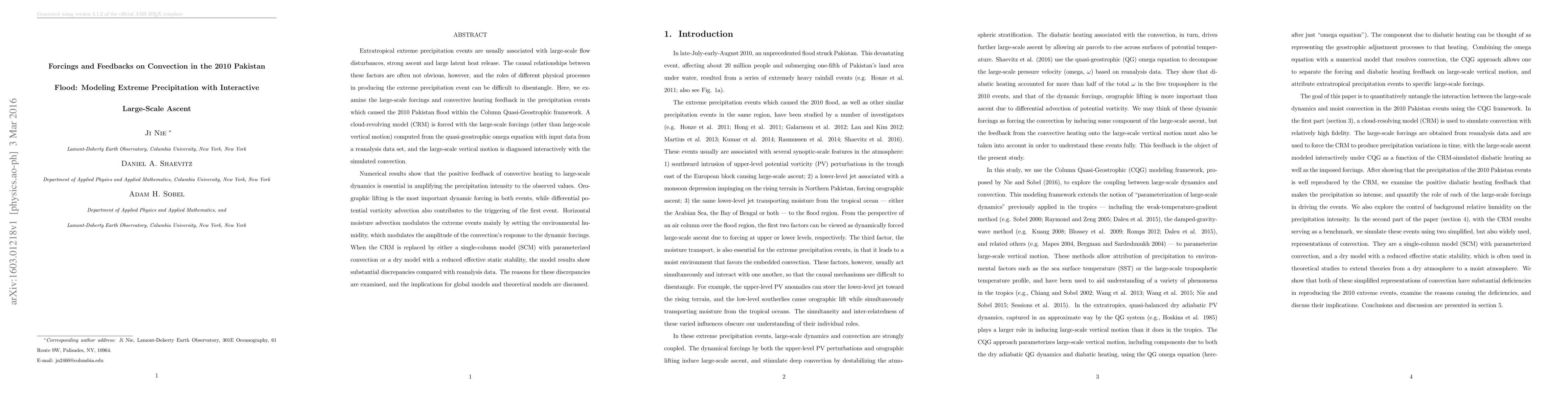 Extratropical extreme precipitation events are usually associated with large-scale flow disturbances, strong ascent and large latent heat release. The causal relationships between these factors are often not obvious, however, and the roles of different physical processes in producing the extreme precipitation event can be difficult to disentangle. Here, we examine the large-scale forcings and convective heating feedback in the precipitation events which caused the 2010 Pakistan flood within the Column Quasi-Geostrophic framework. A cloud-revolving model (CRM) is forced with the large-scale forcings (other than large-scale vertical motion) computed from the quasi-geostrophic omega equation with input data from a reanalysis data set, and the large-scale vertical motion is diagnosed interactively with the simulated convection. Numerical results show that the positive feedback of convective heating to large-scale dynamics is essential in amplifying the precipitation intensity to the observed values. Orographic lifting is the most important dynamic forcing in both events, while differential potential vorticity advection also contributes to the triggering of the first event. Horizontal moisture advection modulates the extreme events mainly by setting the environmental humidity, which modulates the amplitude of the convection's response to the dynamic forcings. When the CRM is replaced by either a single-column model (SCM) with parameterized convection or a dry model with a reduced effective static stability, the model results show substantial discrepancies compared with reanalysis data. The reasons for these discrepancies are examined, and the implications for global models and theoretical models are discussed.